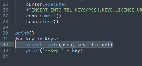 you should use placeholders to bind the values, something likeCode:f"INSERT INTO TBL_KEYS(PSSH,KEYS,LICENSE_URL) VALUES ('{pssh}','{keys}','{lic_url}')")