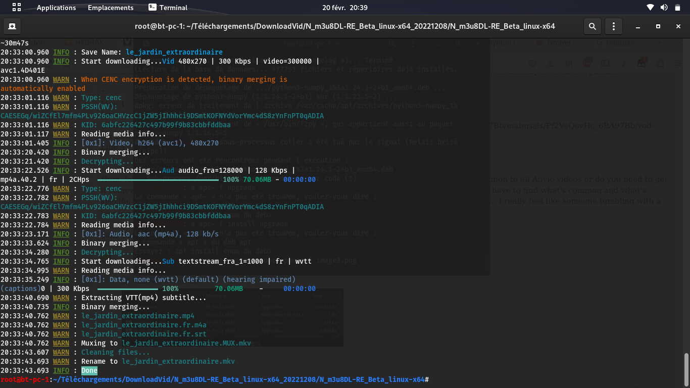 I picked up the mp4decrypt file alone and placed it in my Auvio download folder and launched that .bat again. This time I went much further ! When I though I was pinning down the video, at the very end, when I had the video, the audio and the subtitles, when all that was left to do was to mux/merge everything, the end of the script said that it had failed to get the right number of files and..... cleared everything up, leaving a useless 58kb .mkv file...
