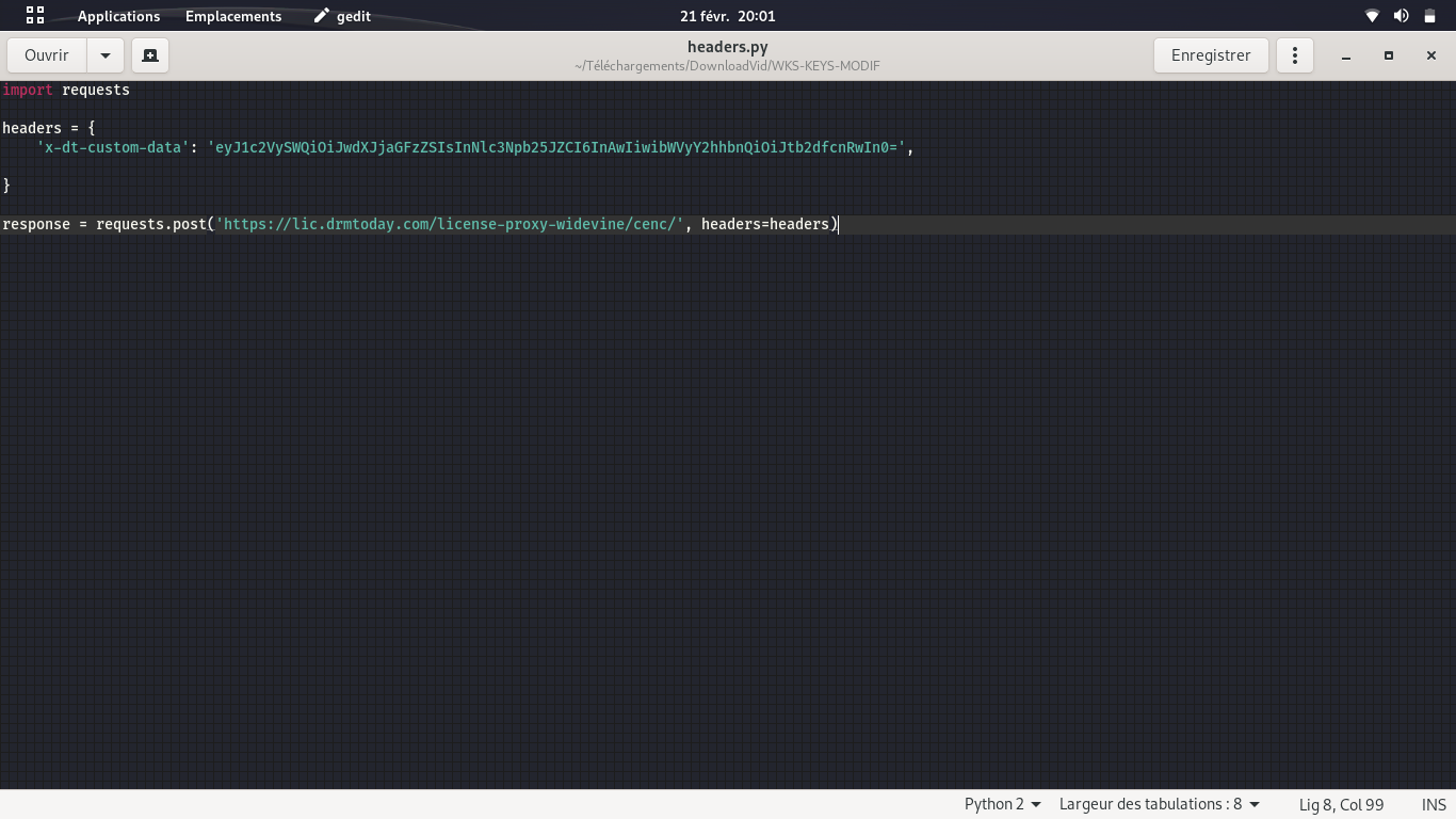 Code:headers: import requests headers = { 'Accept': '*/*', 'Accept-Language': 'en-GB,en;q=0.9', 'Cache-Control': 'no-cache', 'Connection': 'keep-alive', 'Origin': 'https://www.rtp.pt', 'Pragma': 'no-cache', 'Referer': 'https://www.rtp.pt/', 'Sec-Fetch-Dest': 'empty', 'Sec-Fetch-Mode': 'cors', 'Sec-Fetch-Site': 'cross-site', 'User-Agent': 'Mozilla/5.0 (Windows NT 10.0; Win64; x64) AppleWebKit/537.36 (KHTML, like Gecko) Chrome/110.0.0.0 Safari/537.36', 'sec-ch-ua': '"Chromium";v="110", "Not A(Brand";v="24", "Google Chrome";v="110"', 'sec-ch-ua-mobile': '?0', 'sec-ch-ua-platform': '"Windows"', 'x-dt-custom-data': 'eyJ1c2VySWQiOiJwdXJjaGFzZSIsInNlc3Npb25JZCI6InAwIiwibWVyY2hhbnQiOiJtb2dfcnRwIn0=', 'Content-Type': 'application/x-www-form-urlencoded', } data = '\b\x04' response = requests.post('https://lic.drmtoday.com/license-proxy-widevine/cenc/', headers=headers, data=data)