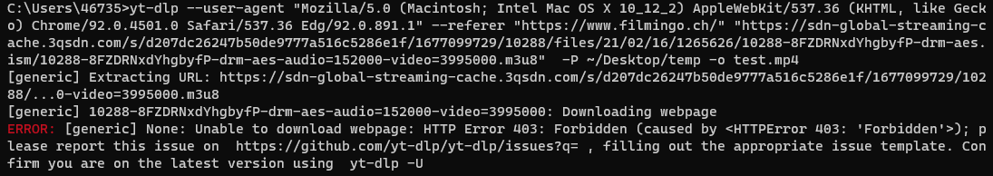 yt-dlp --user-agent "Mozilla/5.0 (X11; Linux x86_64; rv:109.0) Gecko/20100101 Firefox/110.0" --referer "https://www.filmingo.ch/" "https://sdn-global-streaming-cache.3qsdn.com/s/12f17721cda2b949e5142e0dd8bfd2fd/1677089385/10288/files/19/09/1265430/10288-xkt3jBbp4W9GnrZ-drm-aes.ism/10288-xkt3jBbp4W9GnrZ-drm-aes-audio=152000-video=4010000.m3u8" -P ~/Desktop/temp -o test.mp4