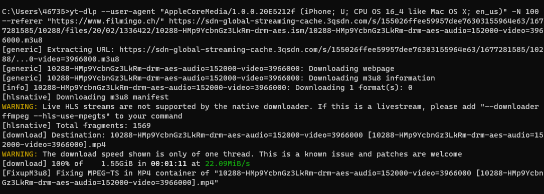 yt-dlp --no-part --restrict-filenames -N 4 --user-agent "Mozilla/5.0 (X11; Linux x86_64; rv:109.0) Gecko/20100101 Firefox/110.0" --referer "https://www.filmingo.ch/" "https://sdn-global-streaming-cache.3qsdn.com/s/044116f41dc6b3f57fa0a653f7c810be/1677085285/10288/files/19/09/1265430/10288-xkt3jBbp4W9GnrZ-drm-aes.ism/10288-xkt3jBbp4W9GnrZ-drm-aes-audio=128000-video=706000.m3u8"