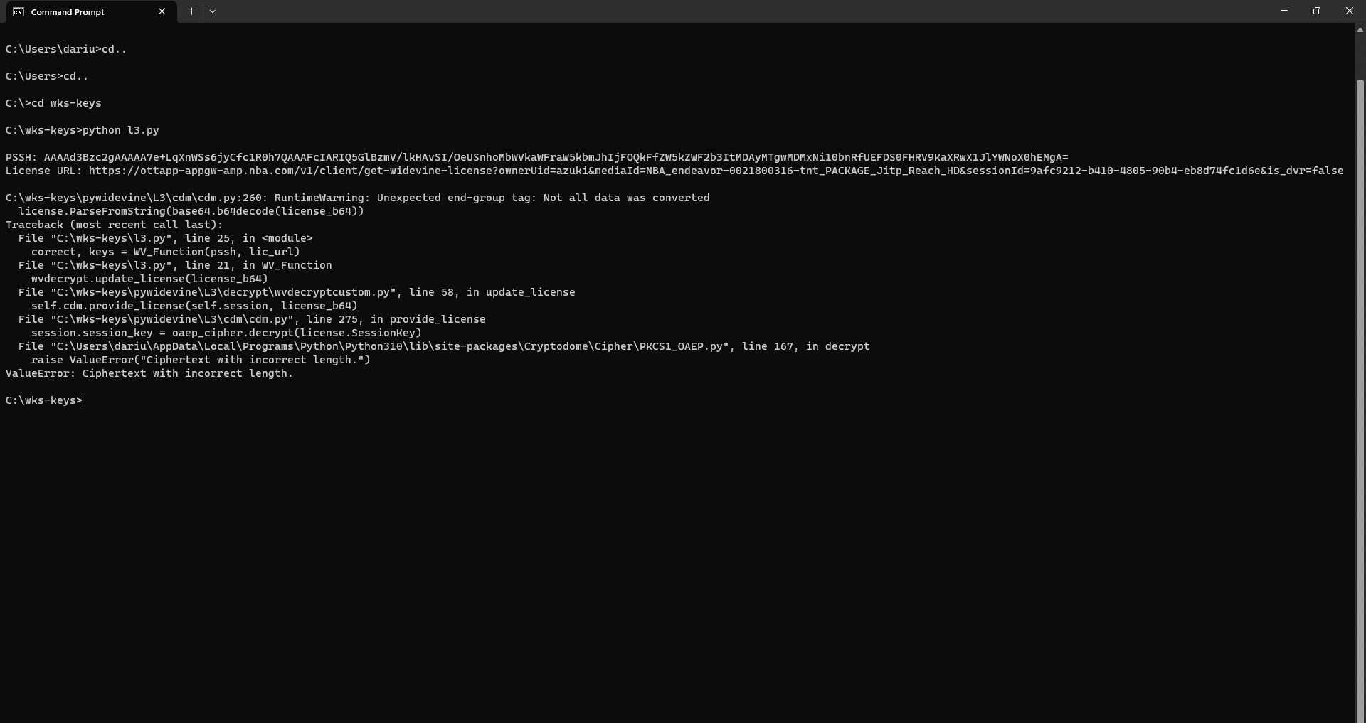 I understand what you are saying but how come the useless data work on one PC and doesnt work on another. I just tried like you said and I still got the error. For me wks even gives the error when you have incorrect header because on this site one video have 2 headers most of the time sometimes 3 and after using one of them I get the key but next time I enter python l3.py the PSSH doesn't show up I get something like