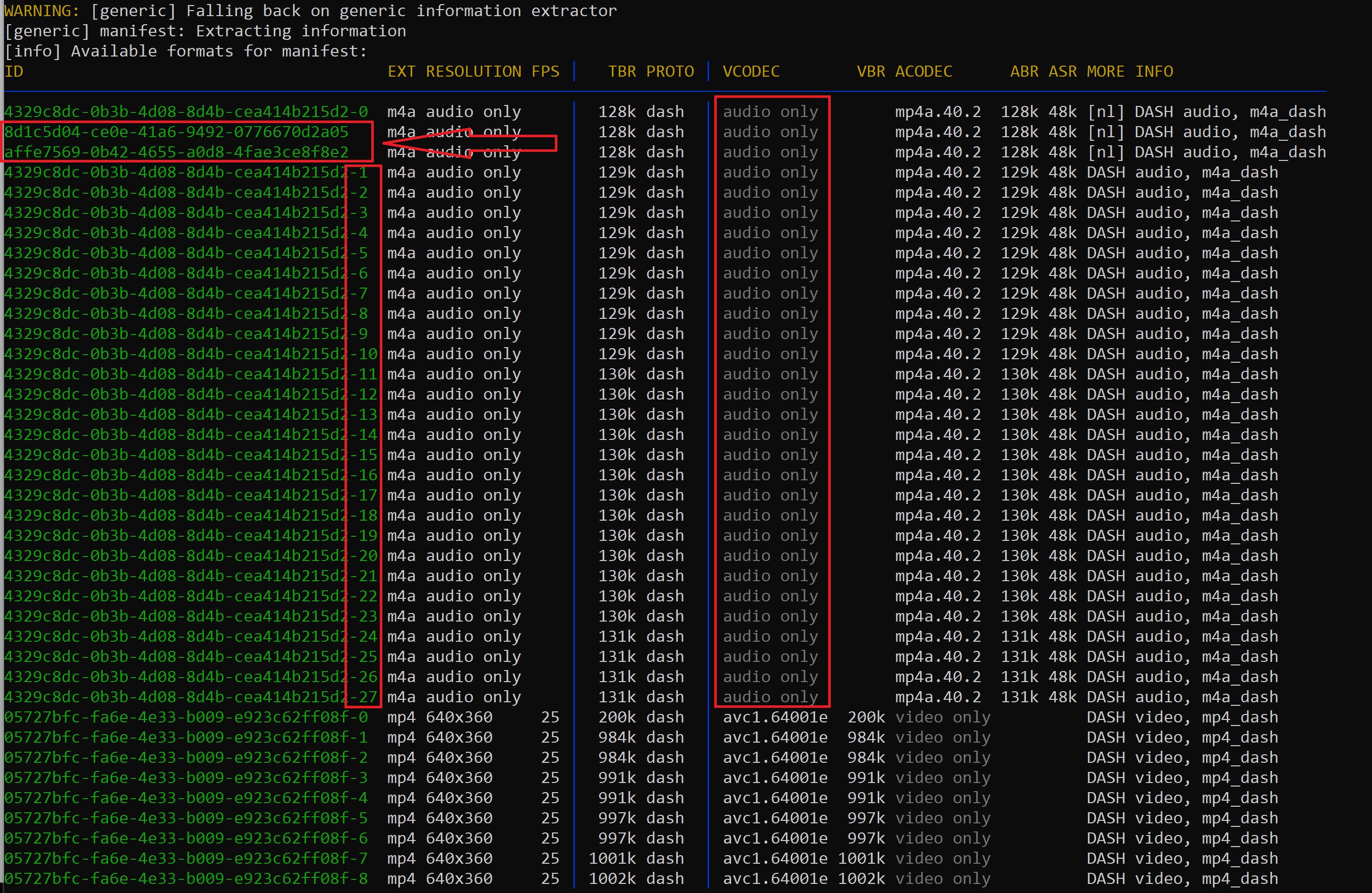 This returns a list, in my case with a bunch of audio formats ending with -0 -1 -2 etc, all those are nasty ads.Code:yt-dlp --list-formats http://blabla.mpd