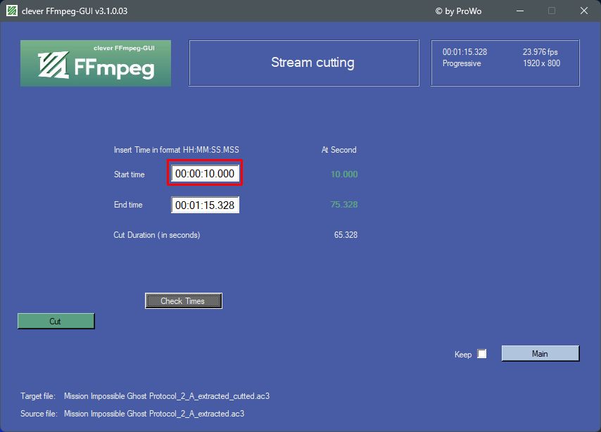 Start it, load your ac3, click main, click cut, enter 10 seconds in the start time field, leave all other values as they are, click check times, click cut.