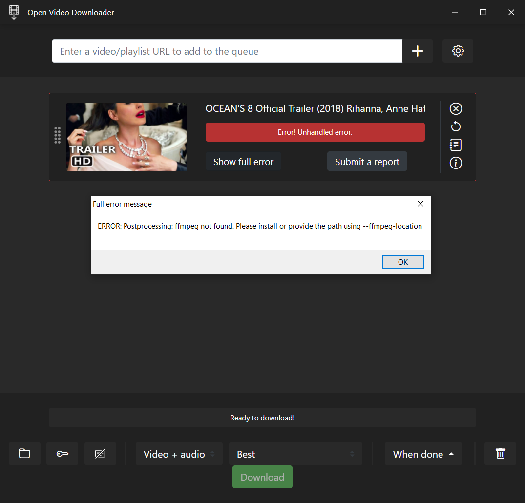Trying to get Open Video Downloader working on Windows 10 but on trying to download a video with it I get: