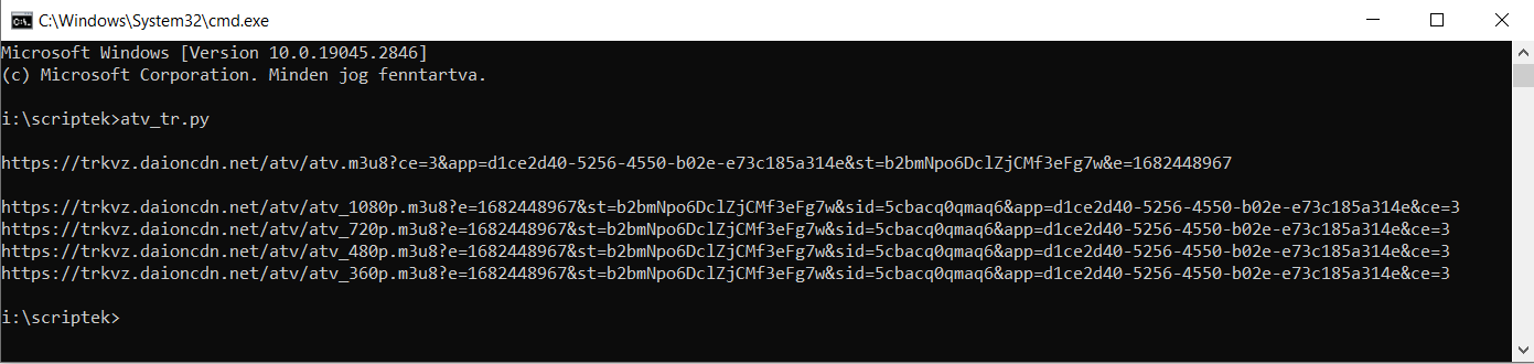 Code:import requests import re print('\ntest link: https://www.atv.com.tr/kurulus-osman/121-bolum/izle\ntest link: https://www.atv.com.tr/akinci-cizgi-dizi/9-bolum/izle\n') link = input('link: ') headers = { 'authority': 'www.atv.com.tr', 'accept': 'text/html,application/xhtml+xml,application/xml;q=0.9,image/avif,image/webp,image/apng,*/*;q=0.8,application/signed-exchange;v=b3;q=0.9', 'user-agent': 'Mozilla/5.0 (Windows NT 10.0; WOW64) AppleWebKit/537.36 (KHTML, like Gecko) Chrome/102.0.0.0 Safari/537.36', } resp1 = requests.get(link, headers=headers).text video_id = re.findall(r'contentUrl\":\"(.*)_', resp1)[0].strip() headers = { 'Origin': 'https://www.atv.com.tr', 'Referer': 'https://www.atv.com.tr/', 'User-Agent': 'Mozilla/5.0 (Windows NT 10.0; Win64; x64) AppleWebKit/537.36 (KHTML, like Gecko) Chrome/112.0.0.0 Safari/537.36', } resp2 = requests.get('https://securevideotoken.tmgrup.com.tr/webtv/secure?000000&url='+video_id+'.hb.smil%2Fplaylist.m3u8', headers=headers).json() m3u8_url = resp2['Url'] print(f'\n{m3u8_url}\n')