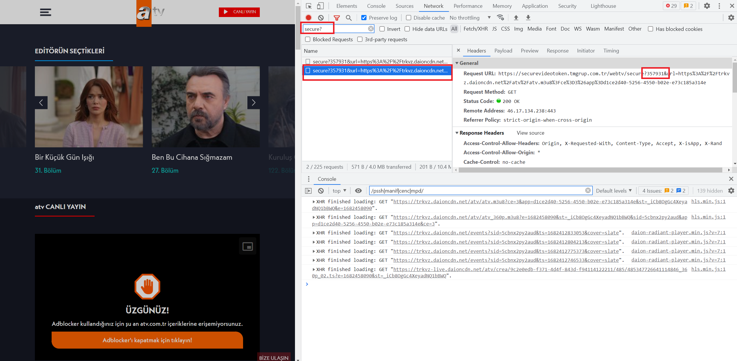 Code:curl "https://securevideotoken.tmgrup.com.tr/webtv/secure?000000&url=https%3A%2F%2Ftrkvz.daioncdn.net%2Fatv%2Fatv.m3u8%3Fce%3D3%26app%3Dd1ce2d40-5256-4550-b02e-e73c185a314e" -H "Origin: https://www.atv.com.tr" -H "Referer: https://www.atv.com.tr/" -H "User-Agent: Mozilla/5.0 (Windows NT 10.0; Win64; x64) AppleWebKit/537.36 (KHTML, like Gecko) Chrome/112.0.0.0 Safari/537.36"