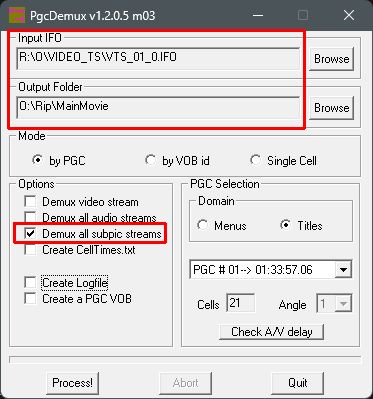 Start the app, browse for the wanted titleset IFO, browse for your output folder, select demux all subpics streams, deselect all other, click process.