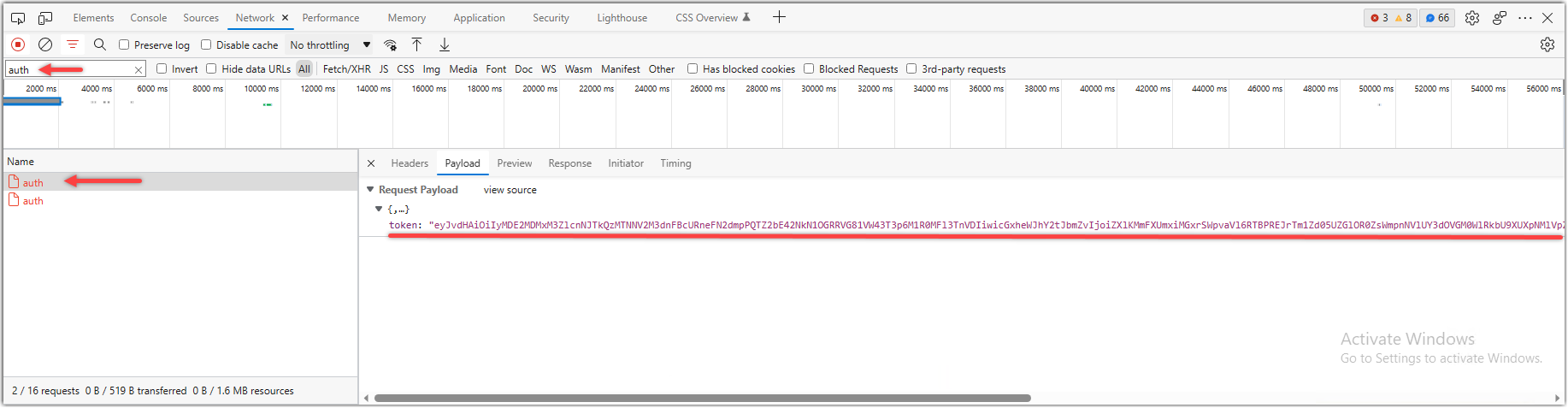 For the token payload, you will need to block the auth request from completing and fetch it from the browser while it's in red.