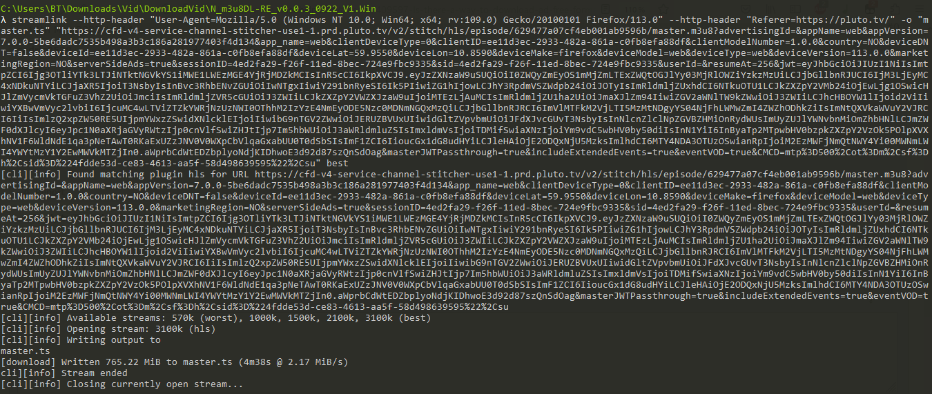 Code:streamlink --http-header "User-Agent=Mozilla/5.0 (Windows NT 10.0; Win64; x64; rv:109.0) Gecko/20100101 Firefox/113.0" --http-header "Referer=https://pluto.tv/" -o "master.ts" "https://cfd-v4-service-channel-stitcher-use1-1.prd.pluto.tv/v2/stitch/hls/episode/629477a07cf4eb001ab9596b/master.m3u8?advertisingId=&appName=web&appVersion=7.0.0-5be6dadc7535b498a3b3c186a281977403f4d134&app_name=web&clientDeviceType=0&clientID=ee11d3ec-2933-482a-861a-c0fb8efa88df&clientModelNumber=1.0.0&country=NO&deviceDNT=false&deviceId=ee11d3ec-2933-482a-861a-c0fb8efa88df&deviceLat=59.9550&deviceLon=10.8590&deviceMake=firefox&deviceModel=web&deviceType=web&deviceVersion=113.0.0&marketingRegion=NO&serverSideAds=true&sessionID=4ed2fa29-f26f-11ed-8bec-724e9fbc9335&sid=4ed2fa29-f26f-11ed-8bec-724e9fbc9335&userId=&resumeAt=256&jwt=eyJhbGciOiJIUzI1NiIsImtpZCI6Ijg3OTliYTk3LTJiNTktNGVkYS1iMWE1LWEzMGE4YjRjMDZkMCIsInR5cCI6IkpXVCJ9.eyJzZXNzaW9uSUQiOiI0ZWQyZmEyOS1mMjZmLTExZWQtOGJlYy03MjRlOWZiYzkzMzUiLCJjbGllbnRJUCI6IjM3LjEyMC4xNDkuNTYiLCJjaXR5IjoiT3NsbyIsInBvc3RhbENvZGUiOiIwNTgxIiwiY291bnRyeSI6Ik5PIiwiZG1hIjowLCJhY3RpdmVSZWdpb24iOiJOTyIsImRldmljZUxhdCI6NTkuOTU1LCJkZXZpY2VMb24iOjEwLjg1OSwicHJlZmVycmVkTGFuZ3VhZ2UiOiJmciIsImRldmljZVR5cGUiOiJ3ZWIiLCJkZXZpY2VWZXJzaW9uIjoiMTEzLjAuMCIsImRldmljZU1ha2UiOiJmaXJlZm94IiwiZGV2aWNlTW9kZWwiOiJ3ZWIiLCJhcHBOYW1lIjoid2ViIiwiYXBwVmVyc2lvbiI6IjcuMC4wLTViZTZkYWRjNzUzNWI0OThhM2IzYzE4NmEyODE5Nzc0MDNmNGQxMzQiLCJjbGllbnRJRCI6ImVlMTFkM2VjLTI5MzMtNDgyYS04NjFhLWMwZmI4ZWZhODhkZiIsImNtQXVkaWVuY2VJRCI6IiIsImlzQ2xpZW50RE5UIjpmYWxzZSwidXNlcklEIjoiIiwibG9nTGV2ZWwiOiJERUZBVUxUIiwidGltZVpvbmUiOiJFdXJvcGUvT3NsbyIsInNlcnZlclNpZGVBZHMiOnRydWUsImUyZUJlYWNvbnMiOmZhbHNlLCJmZWF0dXJlcyI6eyJpc1N0aXRjaGVyRWtzIjp0cnVlfSwiZHJtIjp7Im5hbWUiOiJ3aWRldmluZSIsImxldmVsIjoiTDMifSwiaXNzIjoiYm9vdC5wbHV0by50diIsInN1YiI6InByaTp2MTpwbHV0bzpkZXZpY2VzOk5POlpXVXhNV1F6WldNdE1qa3pNeTAwT0RKaExUZzJNV0V0WXpCbVlqaGxabUU0T0dSbSIsImF1ZCI6IioucGx1dG8udHYiLCJleHAiOjE2ODQxNjU5MzksImlhdCI6MTY4NDA3OTUzOSwianRpIjoiM2EzMWFjNmQtNWY4Yi00MWNmLWI4YWYtMzY1Y2EwMWVkMTZjIn0.aWprbCdWtEDZbplyoNdjKIDhwoE3d92d87szQnSdOag&masterJWTPassthrough=true&includeExtendedEvents=true&eventVOD=true&CMCD=mtp%3D500%2Cot%3Dm%2Csf%3Dh%2Csid%3D%224fdde53d-ce83-4613-aa5f-58d498639595%22%2Csu" best