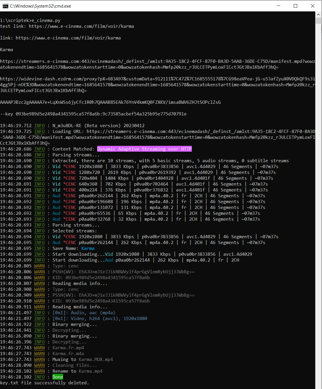 Code:import base64, requests, sys, xmltodict, json, os from pywidevine.L3.cdm import cdm, deviceconfig from base64 import b64encode from pywidevine.L3.decrypt.wvdecryptcustom import WvDecrypt import subprocess m3u8DL_RE = 'N_m3u8DL-RE.exe' delete_file = 'key.txt' if os.path.exists(delete_file): os.remove(delete_file) print("key.txt file successfully deleted.") print('test link: https://www.e-cinema.com/film/voir/karma\n') link = input('link: ') import requests import re cookies1 = { 'ci_session': '*ci_session_here*', } headers1 = { 'authority': 'www.e-cinema.com', 'accept': 'text/html,application/xhtml+xml,application/xml;q=0.9,image/webp,image/apng,*/*;q=0.8,application/signed-exchange;v=b3;q=0.7', 'accept-language': 'en;q=0.9,en-GB;q=0.8,en-US;q=0.7', 'user-agent': 'Mozilla/5.0 (Windows NT 10.0; Win64; x64) AppleWebKit/537.36 (KHTML, like Gecko) Chrome/113.0.0.0 Safari/537.36 Edg/113.0.1774.57', } response1 = requests.get(link, cookies=cookies1, headers=headers1).text title = re.findall(r'class=\"titresection\">(.*?)<', response1)[0].strip() print(f'\n{title}\n') mpd_part1 = re.findall(r'dash:\"(.*?mpd)\"', response1)[0].strip() mpd_part2 = re.findall(r"wowzatokenendtime:..(.*?)'", response1)[0].strip() mpd_part3 = re.findall(r"wowzatokenhash:..(.*?)'", response1)[0].strip() mpd = f'{mpd_part1}?wowzatokenendtime={mpd_part2}&wowzatokenstarttime=0&wowzatokenhash={mpd_part3}' print(f'{mpd}\n') lic_url_part1 = re.findall(r'(widevine-dash.ezdrm.*?)\"', response1)[0].strip() lic_url = f'https://{lic_url_part1}&wowzatokenendtime={mpd_part2}&wowzatokenendtime={mpd_part2}&wowzatokenstarttime=0&wowzatokenhash={mpd_part3}' print(f'{lic_url}\n') import requests headers2 = { 'user-agent': 'Mozilla/5.0 (Windows NT 10.0; Win64; x64) AppleWebKit/537.36 (KHTML, like Gecko) Chrome/113.0.0.0 Safari/537.36', } response2 = requests.get(mpd, headers=headers2).text pssh = re.findall(r'<cenc:pssh>(.{20,170})<\/cenc:pssh>', response2)[0].strip() print(f'{pssh}\n') import requests headers = { 'Connection': 'keep-alive', 'Origin': 'https://www.e-cinema.com', 'Referer': 'https://www.e-cinema.com/', 'User-Agent': 'Mozilla/5.0 (Windows NT 10.0; Win64; x64) AppleWebKit/537.36 (KHTML, like Gecko) Chrome/113.0.0.0 Safari/537.36 Edg/113.0.1774.57', } def WV_Function(pssh, lic_url, cert_b64=None): wvdecrypt = WvDecrypt(init_data_b64=pssh, cert_data_b64=cert_b64, device=deviceconfig.device_android_generic) widevine_license = requests.post(url=lic_url, data=wvdecrypt.get_challenge(), headers=headers) license_b64 = b64encode(widevine_license.content) wvdecrypt.update_license(license_b64) Correct, keyswvdecrypt = wvdecrypt.start_process() if Correct: return Correct, keyswvdecrypt Correct, keys = WV_Function(pssh, lic_url) st='' for key in keys: st+=' --key '+key with open("key.txt","a+") as f: f.write(st[1:]+'\n') with open("key.txt", "r") as f2: datas = f2.read() print(datas) with open("key.txt", "r") as fs: ke_ys = fs.readlines() ke_ys = ke_ys[0].strip().split() subprocess.run([m3u8DL_RE, '--auto-select', '--binary-merge', '--log-level', 'INFO', '--download-retry-count', '8', '--concurrent-download', '--save-name', title, '-M', 'format=mp4:muxer=ffmpeg', *ke_ys, mpd]) if os.path.exists(delete_file): os.remove(delete_file) print("key.txt file successfully deleted.") -