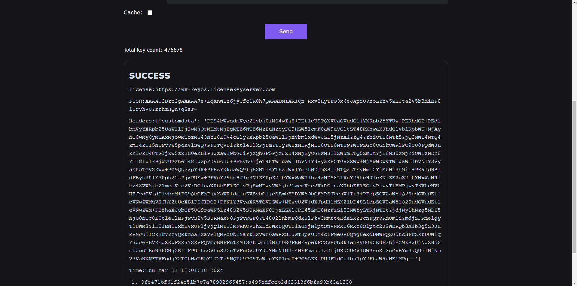 Code:access-control-allow-headers Origin, X-Requested-With, Content-Type, Cache-Control, Pragma, Accept, SOAPAction, customdata, Authorization, X-KeyOS-Authorization access-control-allow-methods HEAD, POST, GET, OPTIONS access-control-allow-origin * content-type application/octet-stream date Wed, 20 Mar 2024 18:58:22 GMT X-Firefox-Spdy h2 Accept */* Accept-Encoding gzip, deflate, br Accept-Language fr,fr-FR;q=0.8,en-US;q=0.5,en;q=0.3 Connection keep-alive Content-Length 2 Content-type application/octet-stream customdata PD94bWwgdmVyc2lvbj0iMS4wIj8+PEtleU9TQXV0aGVudGljYXRpb25YTUw+PERhdGE+PEdlbmVyYXRpb25UaW1lPjIwMjQtMDMtMjAgMTg6NTg6MTYuNTk0PC9HZW5lcmF0aW9uVGltZT48RXhwaXJhdGlvblRpbWU+MjAyNC0wMy0yMCAxOTowODoxNi41OTQ8L0V4cGlyYXRpb25UaW1lPjxVbmlxdWVJZD45Yzc4MDU3NTQ5YWM0NDNlOGFmNDkwZjRlMmE4MjlhYTwvVW5pcXVlSWQ+PFJTQVB1YktleUlkPjBmYTIyYWUzNDRjMDU0OTE0NTUwYWIwZGY0OGNkOWRlPC9SU0FQdWJLZXlJZD48TGljZW5zZSB0eXBlPSJzaW1wbGUiPjxQbGF5PjxJZD5jOTRhOTIwNi05YjQxLTQ1MGEtOWE4OC03ZWMxZGFmMDZkNjE8L0lkPjwvUGxheT48L0xpY2Vuc2U+PFBvbGljeT48TWluaW11bVNl…mVQZy90SEZSZXN1bWRaY2htNVlMcTRFd3VhRDZDMFd6bzlWOFZpNzV3UHBpd3BQTGtOQUhDVjFoMk4rTXNXcHpmRFlzTisvdHBJekhLT1BEYmUrR0FiRmQxSXRFZExJd1U5bTVvTFUwUExoMXZOL1hUYzZrODZGUmlCVFlncHBDK2x6OHJaT2Y1VndTMEtmOGw4NW9XeDliS3RuWkVaaEhRSm1mc2dPbWxkV0pqVGl1YTMzaXN6Z3dMSk9rRHpRQmpYbnBIeXhMR3JMZXoyK2poa2dpT1dIVHN2aTdWV25OSE1xWFlGTGRnM05MNCtrWFM1SHAwd1BzTk5OaER2RzE2QmZkakpzbS9Uc2tnUE04NVFUREhESldYNWUvdExXcjlEMWl5dHJKaXZUZXJFeksrb1I3RlMwelFhelNNaWhUd2VaOXNZaVlOTnZuSzNpclB1ZmVMdz09PC9TaWduYXR1cmU+PC9LZXlPU0F1dGhlbnRpY2F0aW9uWE1MPg== DNT 1 Host wv-keyos.licensekeyserver.com Origin https://www.kanopy.com Referer https://www.kanopy.com/ Sec-Fetch-Dest empty Sec-Fetch-Mode cors Sec-Fetch-Site cross-site Sec-GPC 1 TE trailers User-Agent Mozilla/5.0 (Windows NT 10.0; Win64; x64; rv:123.0) Gecko/20100101 Firefox/123.0
