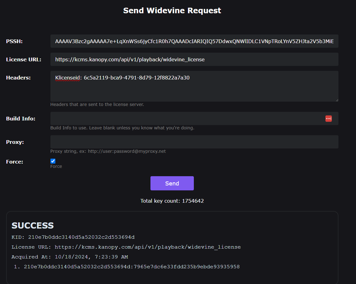 Example, for other videos I have access to:Code:licurl = "https://kcms.kanopy.com/api/v1/playback/widevine_license" lic_headers = { "Klicenseid": drmLicenseId, }