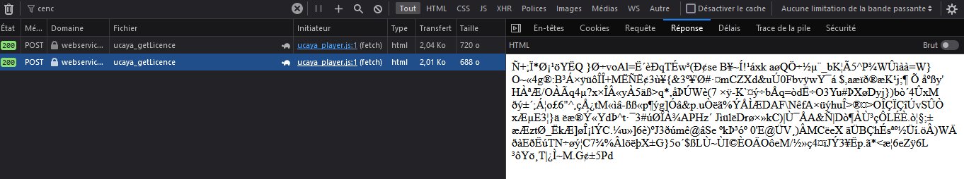 and it's the only time when widewine appears somewhere.Code:curl "https://webservices-web.filmotv.fr/V5/ucaya_getLicence" --compressed -X POST -H "User-Agent: Mozilla/5.0 (Windows NT 10.0; Win64; x64; rv:109.0) Gecko/20100101 Firefox/114.0" -H "Accept: */*" -H "Accept-Language: fr,fr-FR;q=0.8,en-US;q=0.5,en;q=0.3" -H "Accept-Encoding: gzip, deflate, br" -H "Referer: https://www.filmotv.fr/" -H "Authorization: id_prog=24243&token=d27df5b8-e40a-74c4-b5c0-46eccfcc4e81&drm=widevine&type=streaming&cert=vJO5gVlkLwbKBZ419XdPTRRYOxetuLpFVPbyHYlOLuv5JkOhbjAYNtpXdFZpFJc4Ua3mdikYyx-n7kXUsmNh470gR9rbpWFVGxHFGCwOhNKIpSZApnqfTjsM1VnKzdv_uJqawe4WSXfU9RaWsQCT_TSajbXkdOsYXfaMreIv_ekK7FyB6V6S-FcDuka3cCLo79jtT5QvvhjaOhsPnYBHpQMw8azudVsw12gk-fHULkz4O68SfG7uV9V5N5Wq07gvL7nne5IxokqdM_BeyWuo_SlxW0p8263rQX38QwW_3yinPRHBRw4cTANjfYBk1ggLWFdOMNfQdMdFzOWLmgFtwQ" -H "Origin: https://www.filmotv.fr" -H "Connection: keep-alive" -H "Sec-Fetch-Dest: empty" -H "Sec-Fetch-Mode: cors" -H "Sec-Fetch-Site: same-site" -H "TE: trailers" --data-raw "^^^^¿+^*"^ "("^ "^^^^ü^^¢Q^^Bb^^Èz^å^¥^^=^^^^z}T^¦^^m;^^ì^ØV^^^m^^ ^Õ^ë^ð^¤^0^8^Ö^ó^^²^B^+"^ "^license.widevine.com^^^^^¹^^Ì^^^^^3:/w*^^^À(^ue^^^·^!^!DQ^^ô^±V^^æ^ì\`^Õe^-"^ "hz.V^¡^^^Óe6x^^#^^^^Í^ÚPW^^¤^â^¢^^¬^Ê^^Ù^^â^ï^±^Û^^Ø^ª^Ñ^^^^%^h^^
