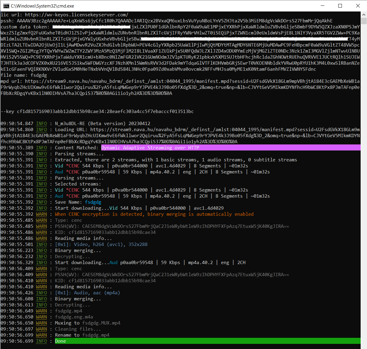 Code:@echo off setlocal enabledelayedexpansion 2>nul del input.html 2>nul del keys.txt set /p "lic_url=lic url: " set /p "pssh=pssh: " set /p "custom_data=custom data token: " curl.exe -s "https://cdrm-project.com/wv" ^ -H "Connection: keep-alive" ^ -H "Origin: https://cdrm-project.com" ^ -H "Referer: https://cdrm-project.com/" ^ -H "User-Agent: Mozilla/5.0 (Windows NT 10.0; WOW64) AppleWebKit/537.36 (KHTML, like Gecko) Chrome/102.0.0.0 Safari/537.36" ^ --data-raw "{\"license\":\"%lic_url%\",\"headers\":\"Connection: keep-alive\",\"customdata\":\"%custom_data%\",\"pssh\":\"%pssh%\",\"buildInfo\":\"\",\"proxy\":\"\",\"cache\":true}" > input.html set /p "filename=file name: " set /p "mpd=mpd url: " echo. for /f "tokens=3 delims=<>" %%a in ('findstr /r "<li.*>.*</li>" input.html') do ( set line=--key %%a echo|set /p=!line! >> keys.txt ) set /p keys=<keys.txt echo. echo %keys% echo. N_m3u8DL-RE.exe %keys% --auto-select --save-name "%filename%" -M "format=mp4:muxer=ffmpeg" "%mpd%" 2>nul del input.html 2>nul del keys.txt -