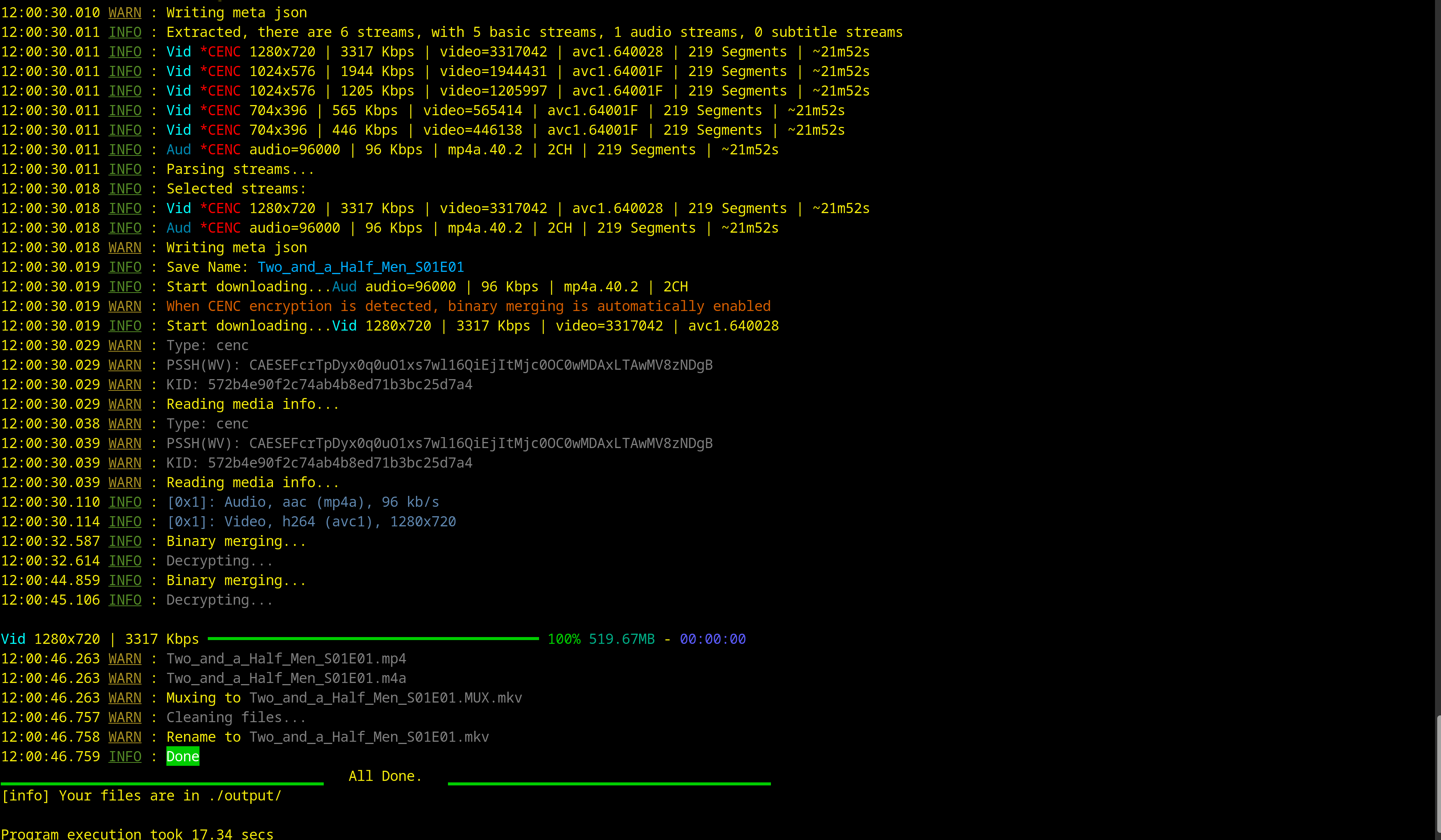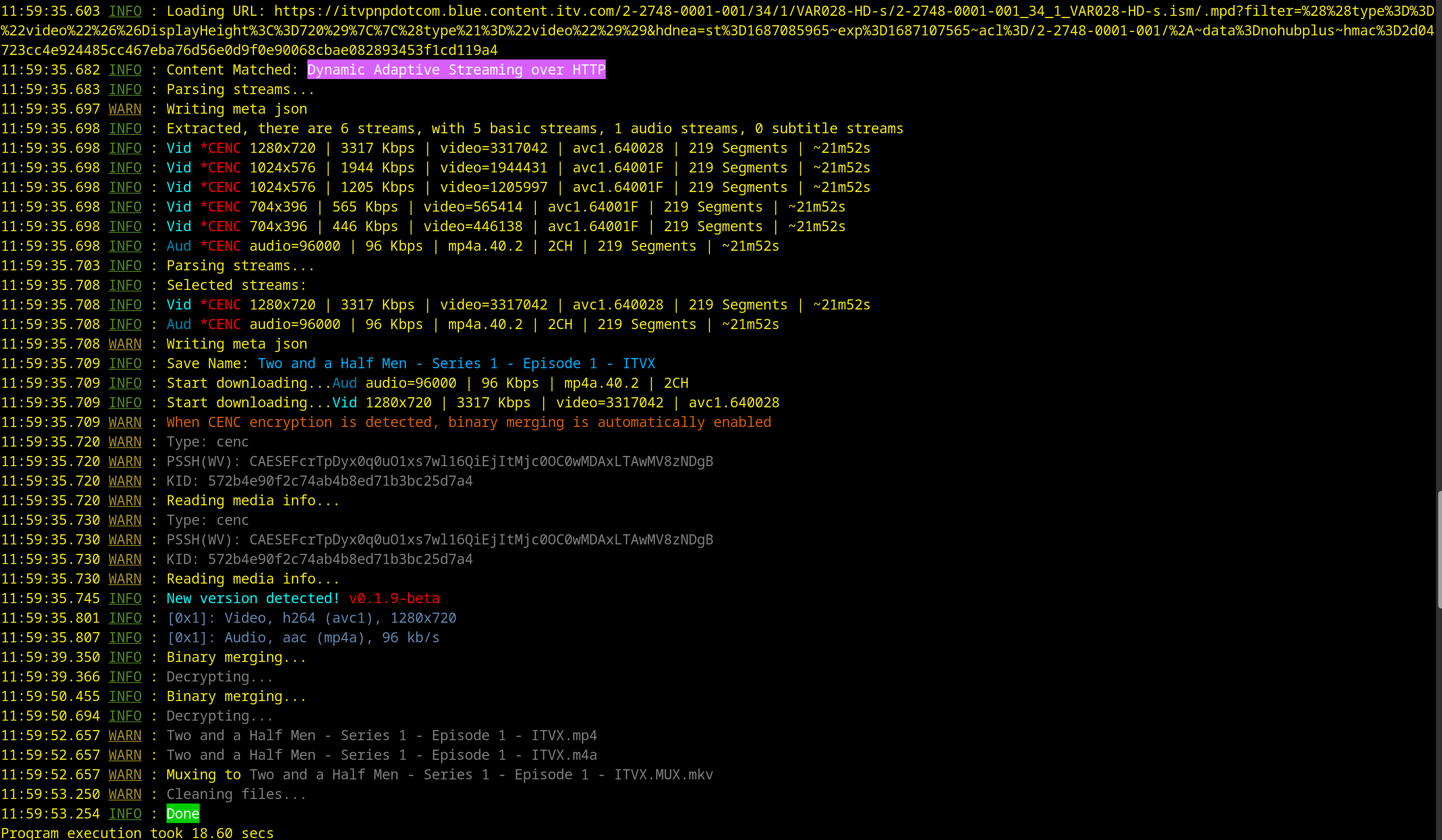 Code:#!/usr/bin/env python3 ''' ITVXbatch.py - a batch downloader for ITVX coded by A_n_g_e_l_a v 2.0 09:06:2023 Requirements: N_m3u8DL-RE, shaka-packager and mkvmerge in $PATH and python modules pyperclip and termcolor may be needed, install with 'pip install pyperclip termcolor' Written for Linux systems using WKS-KEYS with a working CDM, place in the WKS-KEYS folder. Should work on Windows with .exe sprinkled where necessary This program loads content from The Stream Detector to provide mpds and program name. The program reads the clipboard for 'Table Entries' saved from 'The Stream Detector'. Use 'The Stream Detector' browser plugin (Chrome + Firefox + Brave + Kiwi-Browser (Android)) Find here: Firefox version - https://addons.mozilla.org/en-US/firefox/addon/hls-stream-detector/ Chrome version: https://github.com/rowrawer/stream-detector/releases choose hls_stream_detector-2.1X.XX.crx and in chrome://extensions/ set Developer mode (top-right window) and drag and drop the crx file into the window to install Windows is ot officially supported and you may need to unpack the crx file with winrar and the drage the unpacked folder to the extensions window whilst switched to developer mode. First clear all old urls from The Stream Detector (TSD) And then set 'Copy stream URL as' to 'Table Entry' in The Stream Detector GUI Now just visit any number of video pages at ITV.com and the mpd urls will shown in TSD GUI. Copy the Table Entry or Entries to the clipboard from 'The Stream Detector' window when finished selecting videos. Then run this program ''' import os import base64 import requests #from pywidevine.L3.cdm import deviceconfig #from base64 import b64encode #from pywidevine.L3.decrypt.wvdecryptcustom import WvDecrypt import subprocess import re from termcolor import colored import pyperclip as PC import time import functools import math import pyfiglet as PF headers = { 'User-Agent': 'Dalvik/2.9.8 (Linux; U; Android 9.9.2; ALE-L94 Build/NJHGGF)', 'Accept': '*/*', 'Accept-Language': 'en-GB,en;q=0.9', 'Connection': 'keep-alive', 'Referer': 'itv.com', } ''' def WV_Function(pssh, lic_url, cert_b64=None): wvdecrypt = WvDecrypt(init_data_b64=pssh, cert_data_b64=cert_b64, device=deviceconfig.device_android_generic) widevine_license = requests.post(url=lic_url, data=wvdecrypt.get_challenge(), headers=None) license_b64 = b64encode(widevine_license.content) wvdecrypt.update_license(license_b64) Correct, keyswvdecrypt = wvdecrypt.start_process() # chain any multiple keys with --key at the start of all but the first kid:key pair if Correct: mykeys = '' for key in keyswvdecrypt: mykeys += key + '--key' if mykeys.endswith('--key'): mykeys = mykeys[:-5] divides("key found") print(mykeys) return mykeys ''' def WV_Function(pssh, lic_url, cert_b64=None): lic_url = lic_url headers_cdrm = { 'Connection': 'keep-alive', 'Content-Type': 'application/json', 'Origin': 'https://cdrm-project.com', 'Referer': 'https://cdrm-project.com/', 'User-Agent': 'Mozilla/5.0 (Windows NT 10.0; WOW64) AppleWebKit/537.36 (KHTML, like Gecko) Chrome/102.0.0.0 Safari/537.36', } json_data = { 'license': lic_url, 'headers': 'Connection: keep-alive', 'pssh': pssh, 'buildInfo': '', 'proxy': '', 'cache': True, } resp = requests.post('https://cdrm-project.com/wv', headers=headers_cdrm, json=json_data).text keys = re.findall("<li style=\"font-family:'Courier'\">(.+?)<\/li>", resp) if keys: for match in keys: mykeys = '' mykeys += match + '--key' if mykeys.endswith('--key'): mykeys = mykeys[:-5] divides('Key(s)') print(mykeys) return mykeys ## pretty print screen divisions def divides(text): #text = text l = len(text) count, lines = os.get_terminal_size() count = int(count) if count <= 78: count = int(count) else: count = int(math.ceil(count/2)) count = count - l if text != 'null': line = (chr(9601) * int(math.ceil(count/2))) #print("\n") print(colored(line, 'green'), " ", text, " ", colored(line, 'green')) else: line = (chr(9601) * int(count + 10)) print(colored(line, 'green')) def findlicense(mpd_url): bit = mpd_url.split('/',8) ContentID = bit[7].rsplit('_',2 ) license = "https://itvpnp.live.ott.irdeto.com/Widevine/getlicense?CrmId=itvpnp&AccountId=itvpnp&ContentId=" + ContentID[0] divides('license') print(license) return license def generate_pssh(kid: str): str1 = '000000387073736800000000edef8ba979d64acea3c827dcd51d21ed000000181210' str3 = '48e3dc959b06' return base64.b64encode(bytes.fromhex(str1+kid+str3)).decode() # add leading zero to series or episode def pad_number(match): number = int(match.group(1)) return format(number, "02d") def getnm3u8(mpd_url, pssh, videoname): # decrypt lic_url = findlicense(mpd_url) key = WV_Function(pssh, lic_url) # organize cookie cookie = mpd_url.split("&") cookie = cookie[1].split('exp%3D') cookie = 'Cookie: hdntl=exp=' + cookie[1].replace('%3D', '=').replace('%2A', '*').replace('nohubplus', 'hdntl,nohubplus') #print (cookie) divides('Downloading') command = [ "N_m3u8DL-RE", mpd_url, '--append-url-params', '--header', cookie, '--header', "host': itvpnpdotcom.blue.content.itv.com", '--header', "User-Agent': Mozilla/5.0 (Windows NT 10.0; Win64; x64) AppleWebKit/537.36 (KHTML, like Gecko) Chrome/91.0.4472.124 Safari/537.36", "--auto-select", "--save-name", videoname, "--save-dir", "./output", "--tmp-dir", "./", "-mt", "--use-shaka-packager", "--key", key, "-M", "format=mkv:muxer=mkvmerge", ] #print(f"\n\ncommand for N_m3u8DL-re is: {command}\n\n") subprocess.run(command) def timer(func): """Print the runtime of the decorated function""" @functools.wraps(func) def wrapper_timer(*args, **kwargs): start_time = time.perf_counter() # 1 value = func(*args, **kwargs) end_time = time.perf_counter() # 2 run_time = end_time - start_time # 3 #print(f"Finished {func.__name__!r} in {run_time:.4f} secs") print(f"Program execution took {run_time:.2f} secs") return value return wrapper_timer @timer def main(): fmpd = PC.paste().split('\n') mylen = len(fmpd) print(f"There are {mylen} videos to download") divides('ITV