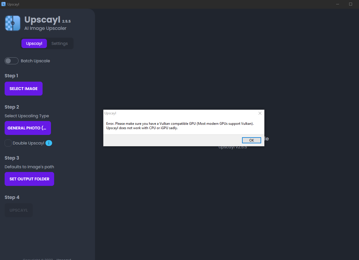 I downloaded a software called "Upscayl" and everytime i try to use it shows this error message and i have no idea, what's going on?