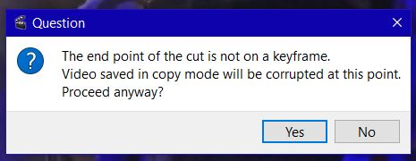 I am novice and senior citizen with issue that I hope you can help. I have an mp4 with copy video / audio config. All I want to do is capture and save a small part. I am not sure I do this correct. What I do is I set Marker A and Marker B for section to remove and when I do 'cut' I keep getting this dialogue (image attached). So I clik no. I do not understand what/which/where is 'endpoint'/'keyframe'. How to resolve?