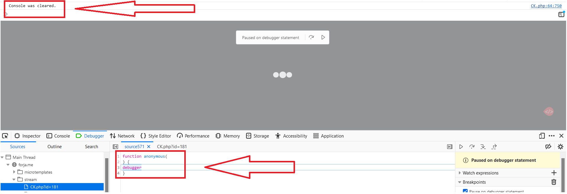 The console output (that is needed to use the EME logger) is cleared automatically by their page. And on top of that, we also have a nasty debugger detector. The logical step would be to get rid of the debugger detector and remove the code that clears the console. But getting rid of the detector ain't that easy for this site specifically. So what's the next thing you can do?
