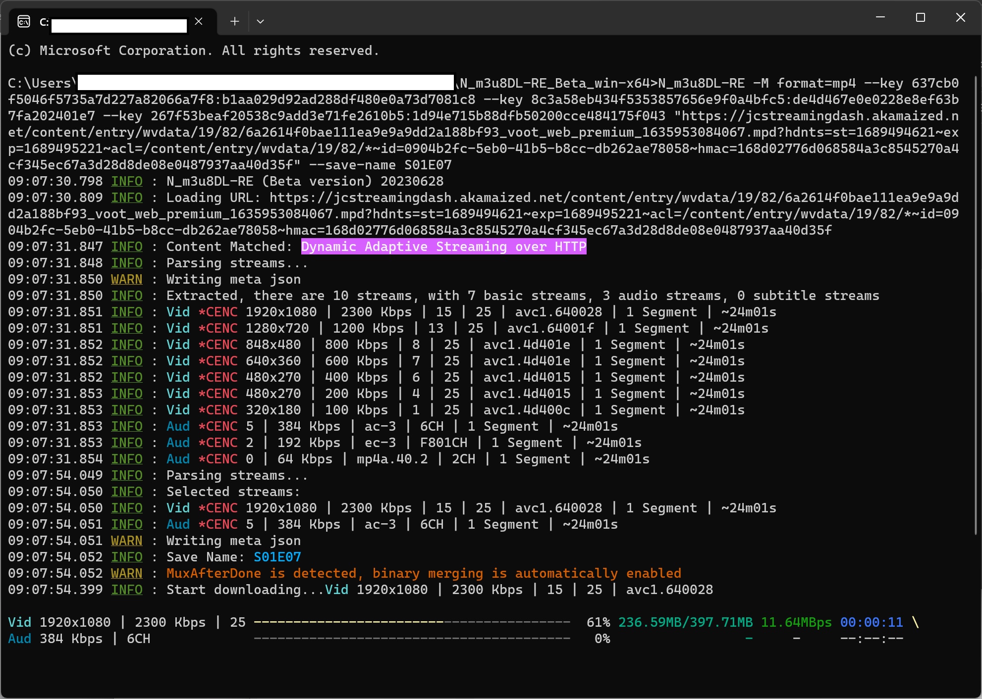 N_m3u8DL-RE -M format=mp4 --key 637cb0f5046f5735a7d227a82066a7f8:b1aa029d92ad288df480e0a73d7081c8 --key 8c3a58eb434f5353857656e9f0a4bfc5:de4d467e0e0228e8ef63b7fa202401e7 --key 267f53beaf20538c9add3e71fe2610b5:1d94e715b88dfb50200cce484175f043 "https://jcstreamingdash.akamaized.net/content/entry/wvdata/19/82/6a2614f0bae111ea9e9a9dd2a188bf93_voot_web_premium_1635953084067.mpd?hdnts=st=1689493142~exp=1689493742~acl=/content/entry/wvdata/19/82/*~id=ad3a0d6b-0cd9-4388-abd8-6299de1967f6~hmac=5d9a058e637448bf2e0276d30e98b4dcc5275da15a55fb0f9f43516e05290257" --save-name S01E07