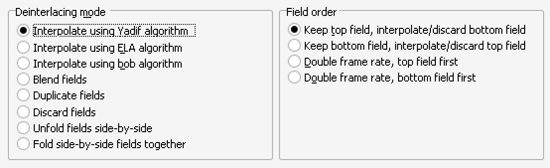 Found a better source. Anyone know what's the best method to utilize for de-interlacing this footage? Could Virtual Dub do the job? I'm using that program, and I see the following options, but not sure which ones to select.