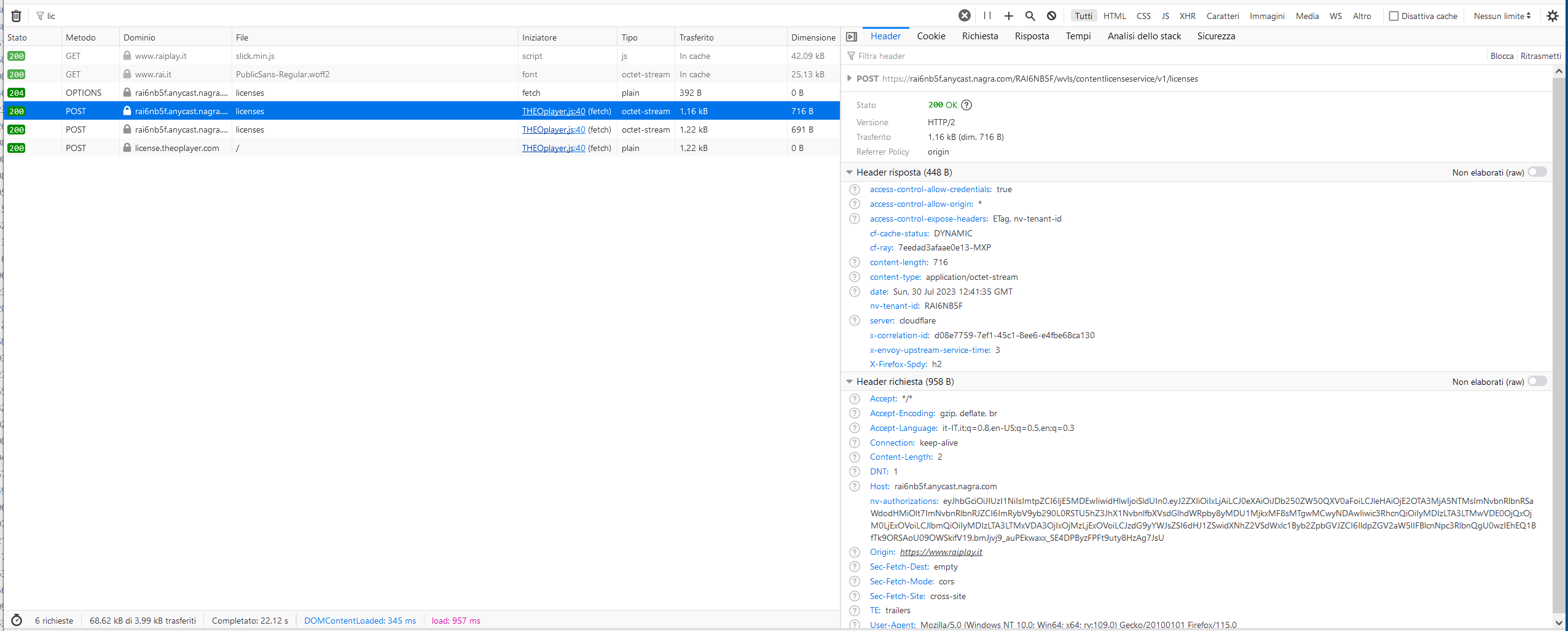 Code:curl 'https://rai6nb5f.anycast.nagra.com/RAI6NB5F/wvls/contentlicenseservice/v1/licenses' -X POST -H 'User-Agent: Mozilla/5.0 (Windows NT 10.0; Win64; x64; rv:109.0) Gecko/20100101 Firefox/115.0' -H 'Accept: */*' -H 'Accept-Language: it-IT,it;q=0.8,en-US;q=0.5,en;q=0.3' -H 'Accept-Encoding: gzip, deflate, br' -H 'nv-authorizations: eyJhbGciOiJIUzI1NiIsImtpZCI6IjE5MDEwIiwidHlwIjoiSldUIn0.eyJ2ZXIiOiIxLjAiLCJ0eXAiOiJDb250ZW50QXV0aFoiLCJleHAiOjE2OTA2MjQ0MjYsImNvbnRlbnRSaWdodHMiOlt7ImNvbnRlbnRJZCI6ImRybV9yb290L0RSTU5hZ3JhX1NvbnlfbXVsdGlhdWRpby8yMDYwNTUxMV8sMTgwMCwyNDAwIiwic3RhcnQiOiIyMDIzLTA3LTI5VDExOjUyOjQ2LjkwOFoiLCJlbmQiOiIyMDIzLTA3LTMwVDA0OjMyOjQ1LjkwOFoiLCJzdG9yYWJsZSI6dHJ1ZSwidXNhZ2VSdWxlc1Byb2ZpbGVJZCI6IldpZGV2aW5lIFBlcnNpc3RlbnQgU0wzIEhEQ1BfTk9ORSAoU09OWSkifV19.eIRRi922hUTvid_oRBcphMSVb_xgXR2bqvsSEHQHuFU' -H 'Origin: https://www.raiplay.it' -H 'DNT: 1' -H 'Connection: keep-alive' -H 'Sec-Fetch-Dest: empty' -H 'Sec-Fetch-Mode: cors' -H 'Sec-Fetch-Site: cross-site' --data-raw $'\x08\x04'