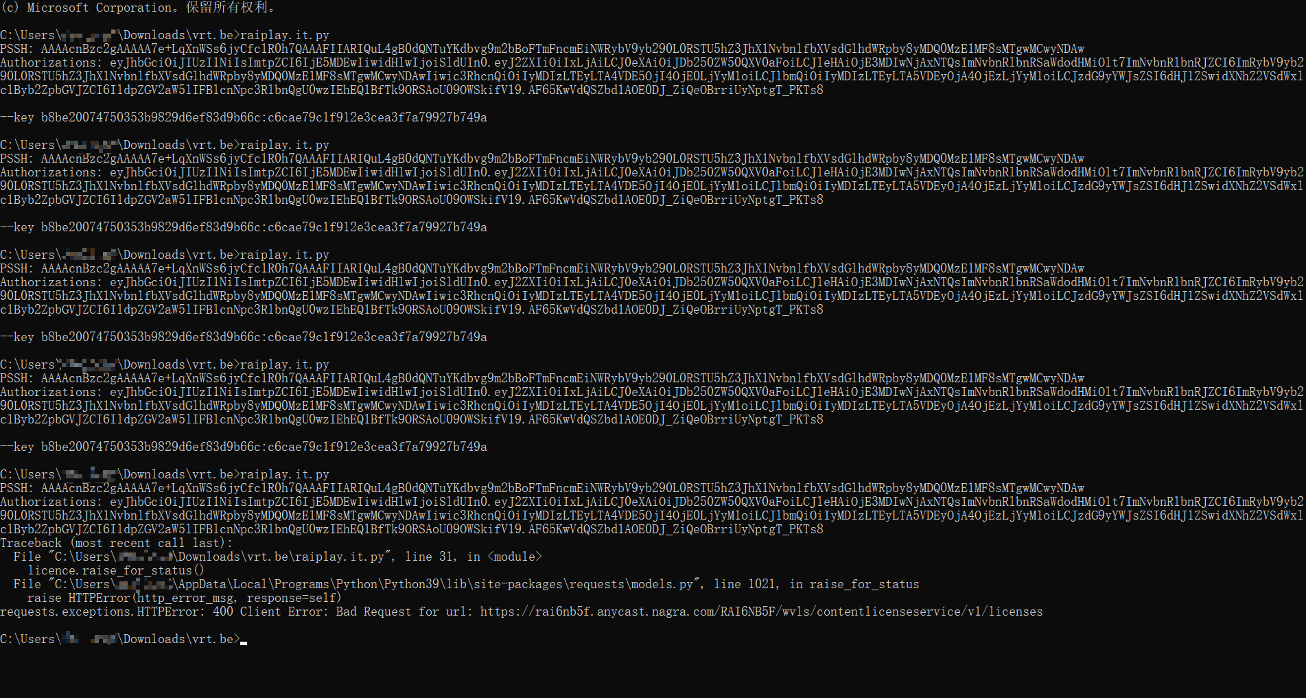 Then inserted PSSH and lic url in WKS-KEYS, but give errorCode:import requests headers = { 'User-Agent': 'Mozilla/5.0 (Windows NT 10.0; Win64; x64; rv:109.0) Gecko/20100101 Firefox/115.0', 'Accept': '*/*', 'Accept-Language': 'it-IT,it;q=0.8,en-US;q=0.5,en;q=0.3', # 'Accept-Encoding': 'gzip, deflate, br', 'nv-authorizations': 'eyJhbGciOiJIUzI1NiIsImtpZCI6IjE5MDEwIiwidHlwIjoiSldUIn0.eyJ2ZXIiOiIxLjAiLCJ0eXAiOiJDb250ZW50QXV0aFoiLCJleHAiOjE2OTA3MjEzMTEsImNvbnRlbnRSaWdodHMiOlt7ImNvbnRlbnRJZCI6ImRybV9yb290L0RSTU5hZ3JhX1NvbnlfbXVsdGlhdWRpby8yMDU1MjkxMF8sMTgwMCwyNDAwIiwic3RhcnQiOiIyMDIzLTA3LTMwVDE0OjQ3OjMyLjM0NVoiLCJlbmQiOiIyMDIzLTA3LTMxVDA3OjI3OjMxLjM0NVoiLCJzdG9yYWJsZSI6dHJ1ZSwidXNhZ2VSdWxlc1Byb2ZpbGVJZCI6IldpZGV2aW5lIFBlcnNpc3RlbnQgU0wzIEhEQ1BfTk9ORSAoU09OWSkifV19.MQGEU-iw5a2rG-K-ZfEM95CZoe9WyZWT5RubraNxbdU', # 'Content-Length': '2', 'Origin': 'https://www.raiplay.it', 'DNT': '1', 'Connection': 'keep-alive', 'Sec-Fetch-Dest': 'empty', 'Sec-Fetch-Mode': 'cors', 'Sec-Fetch-Site': 'cross-site', } response = requests.post('https://rai6nb5f.anycast.nagra.com/RAI6NB5F/wvls/contentlicenseservice/v1/licenses', headers=headers)