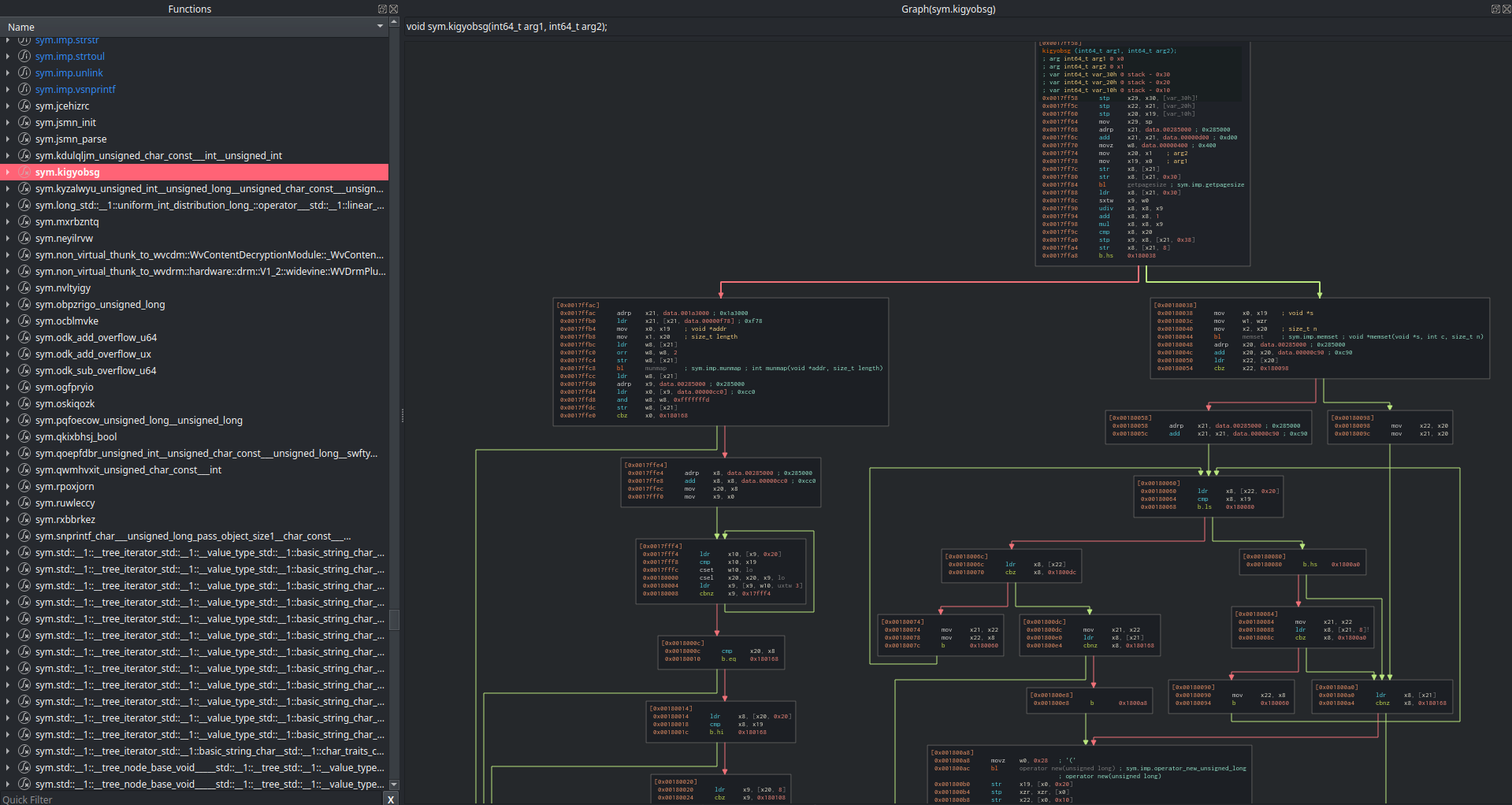 I threw in libwvhidl@1.3.so into a debugger and I think they function that I am after is kigyobsg (I don't have much experience in Widevine keys) but it is one of the only functions which looks like it has a decryption routine (see image).