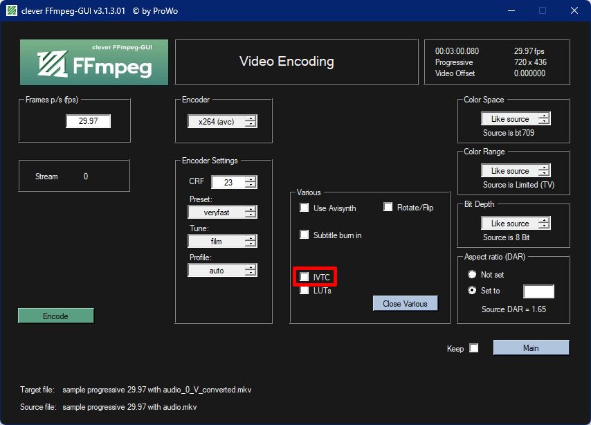 Load your video, click main, click encode video stream, click keep size, set your encoder, click various, check IVTC, click close various, click encode.