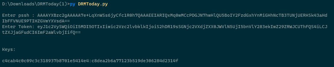 Code:>python DRMToday.py Enter pssh : AAAAYXBzc2gAAAAA7e+LqXnWSs6jyCfc1R0h7QAAAEEIARIQxMq0wMCcPDGJN7hwHlQU5BoIY2FzdGxhYnMiGHhNcTB3TUNjUERHSk43aHdIbFFVNUE9PTIHZGVmYXVsdA== Enter Token: eyJ1c2VySWQiOiI5ODk0MTgiLCJzZXNzaW9uSWQiOiJOcGp3ZWMtWGJDZU03QmRKQkJlVUdpdUpIR0FvWF9NaXZZT3FkSFd5blM4LiIsIm1lcmNoYW50IjoiYXZpaW9uMiJ9 Keys: c4cab4c0c09c3c318937b8701e5414e4:c8dea2b6a77123b519de306284d2314f