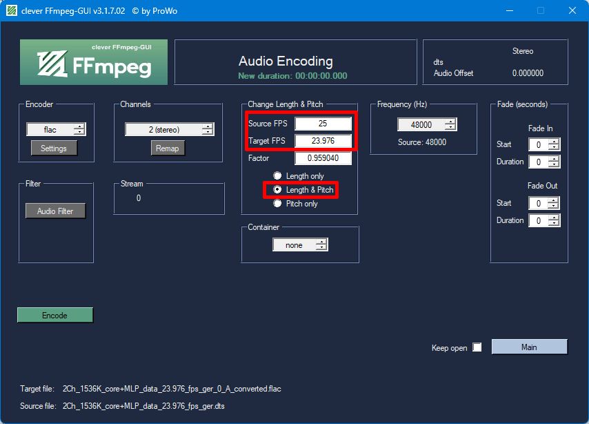 Set flac as encoder, click settings (below), set 16 bit, source fps field is already filled (change it to 25 if it's 50), set target fps to 23.976, set length & pitch, click encode. Done.