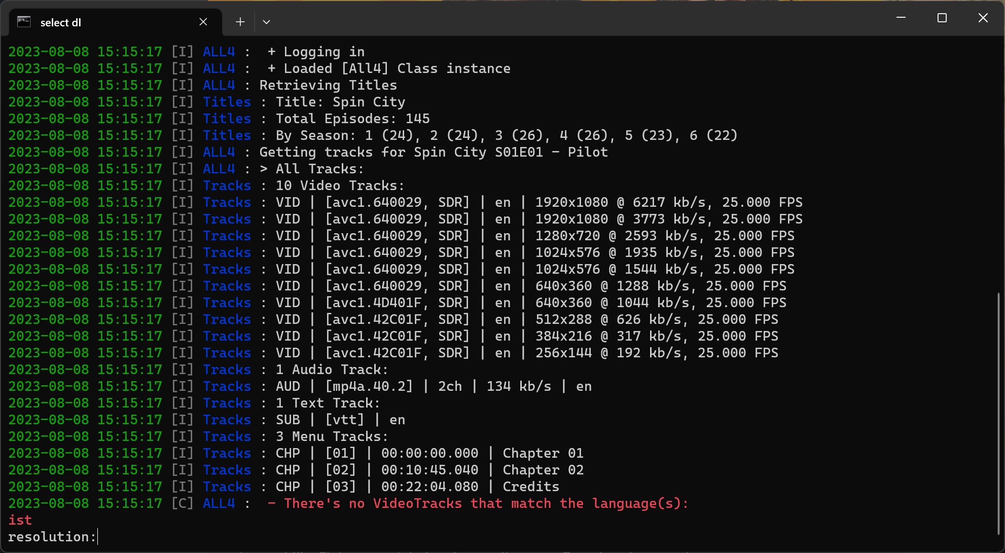 Supernatural S01 (ITV is 720p max):Code:python all4.py -s s01 https://www.channel4.com/programmes/spin-city 16:16:16.446 INFO : Spin City: 6 Season(s), 145 Episode(s) 16:16:18.671 INFO : Spin.City.S01E01.Pilot.ALL4.1080p.WEB-DL.AAC2.0.H.264... http://ak.dash01.stream.c4assets.com/wvmod-stream/CH4_33_05_42_23665001001002_001_HD.mpd?c3.ri=13503846761038226360 --key b7cc79d6cb4dbadbe290d6ce749ba9d6:70a9f4b8e203770b8a5211e492972c0e 16:16:19.368 INFO : Spin.City.S01E02.The.Great.Pretender.ALL4.1080p.WEB-DL.AAC2.0.H.264... http://ak.dash01.stream.c4assets.com/wvmod-stream/CH4_33_05_42_23665002001002_001_HD.mpd?c3.ri=13507224523789916632 --key 4bec37c063d930a9e58aea2ec244ad4f:dc729a28e79629a5c6a65c1ab904813f 16:16:20.092 INFO : Spin.City.S01E03.The.Apartment.ALL4.1080p.WEB-DL.AAC2.0.H.264... http://ak.dash01.stream.c4assets.com/wvmod-stream/CH4_33_05_42_23665003001002_001_HD.mpd?c3.ri=13509476313101253410 --key 7def553a867cb701d39284780ada6ccd:95baa02ce16eb66d1fcb5b851ffbde48 16:16:20.839 INFO : Spin.City.S01E04.Pride.and.Prejudice.ALL4.1080p.WEB-DL.AAC2.0.H.264... http://ak.dash01.stream.c4assets.com/wvmod-stream/CH4_33_05_42_23665004001004_001_HD.mpd?c3.ri=13630229082774114546 --key 973ab6fb09203480f41db4ae4880be98:1c81e0a69e85ab5e7994bc3076a9c527 16:16:21.581 INFO : Spin.City.S01E05.The.Rivals.ALL4.1080p.WEB-DL.AAC2.0.H.264... http://ak.dash01.stream.c4assets.com/wvmod-stream/CH4_33_05_42_23665005001002_001_HD.mpd?c3.ri=13502157913157603003 --key 52e04a3ee6284dfd47a6a9b0d2d39c37:43a8ede5519db317fa000950efd80df0 16:16:22.336 INFO : Spin.City.S01E06.A.Star.Is.Born.ALL4.1080p.WEB-DL.AAC2.0.H.264... http://ak.dash01.stream.c4assets.com/wvmod-stream/CH4_33_05_42_23665006001002_001_HD.mpd?c3.ri=13509476313101253463 --key d144ccd7a27270ff7ded407710066460:c835019a21e47f6046cd7428a24927eb 16:16:23.171 INFO : Spin.City.S01E07.Grand.Illusion.ALL4.1080p.WEB-DL.AAC2.0.H.264... http://ak.dash01.stream.c4assets.com/wvmod-stream/CH4_33_05_42_23665007001002_001_HD.mpd?c3.ri=13503846761038226481 --key 01d2672bcef7f8a078e76637a13f6ecf:a419f6493b1917c735bf87a596025b76 16:16:23.862 INFO : Spin.City.S01E08.The.High.and.the.Mighty.ALL4.1080p.WEB-DL.AAC2.0.H.264... http://ak.dash01.stream.c4assets.com/wvmod-stream/CH4_33_05_42_23665008001002_001_HD.mpd?c3.ri=13500187585820914817 --key ed82f1c59cc60ccb1f045a2ad13da947:887c7bc758e91ea1323a127e4f6bd9a0 16:16:24.654 INFO : Spin.City.S01E09.Meet.Tommy.Dugan.ALL4.1080p.WEB-DL.AAC2.0.H.264... http://ak.dash01.stream.c4assets.com/wvmod-stream/CH4_33_05_42_23665009001002_001_HD.mpd?c3.ri=13630229082774114628 --key 54f7bdd8530f3dfcb334668869f78a0e:5efab9f1208170550dc994fc02156952 16:16:25.440 INFO : Spin.City.S01E10.The.Competiton.ALL4.1080p.WEB-DL.AAC2.0.H.264... http://ak.dash01.stream.c4assets.com/wvmod-stream/CH4_33_05_42_23665010001002_001_HD.mpd?c3.ri=13497654377693867768 --key fa10f39bf752bcbfc9e522ee60b12782:ae4455cf9ab01da5071ce7bbf8e01992 16:16:26.145 INFO : Spin.City.S01E11.Dog.Day.Afternoon.ALL4.1080p.WEB-DL.AAC2.0.H.264... http://ak.dash01.stream.c4assets.com/wvmod-stream/CH4_33_05_42_23665011001002_001_HD.mpd?c3.ri=13509476313101253547 --key e5caf204d5cec3547c8b3a2aa47c02fa:ea90b485bb2737fe6501bc17edd3f687 16:16:26.830 INFO : Spin.City.S01E12.Criss.Cross.ALL4.1080p.WEB-DL.AAC2.0.H.264... http://ak.dash01.stream.c4assets.com/wvmod-stream/CH4_33_05_42_23665012001002_001_HD.mpd?c3.ri=13637547399787864537 --key ba5412d5528020340d304f79f8372419:30a2d9b2a0d88b2332e1e124e3f4f871 16:16:27.502 INFO : Spin.City.S01E13.Bye.Bye.Love.ALL4.1080p.WEB-DL.AAC2.0.H.264... http://ak.dash01.stream.c4assets.com/wvmod-stream/CH4_33_05_42_23665013001002_001_HD.mpd?c3.ri=13500469101834187689 --key 3ec52a3a4b1630283e0d713ca2edcc22:a0c3e494610246f327ea7f9b9d038446 16:16:28.209 INFO : Spin.City.S01E14.Starting.Over.ALL4.1080p.WEB-DL.AAC2.0.H.264... http://ak.dash01.stream.c4assets.com/wvmod-stream/CH4_33_05_42_23665014001002_001_HD.mpd?c3.ri=13637547399787864566 --key a85046953dfda7c60c657125eac24bbf:bc986d18c5cc68a6f1ea6d9e1531a68b 16:16:28.916 INFO : Spin.City.S01E15.Gabbys.Song.ALL4.1080p.WEB-DL.AAC2.0.H.264... http://ak.dash01.stream.c4assets.com/wvmod-stream/CH4_33_05_42_23665015001002_001_HD.mpd?c3.ri=13628540213676942110 --key ea747b006a8efdfa30611384535ac2c1:0dac70df4cecc6232ff36572f18a31ff 16:16:29.605 INFO : Spin.City.S01E16.Kiss.Me.Stupid.ALL4.1080p.WEB-DL.AAC2.0.H.264... http://ak.dash01.stream.c4assets.com/wvmod-stream/CH4_33_05_42_23665016001002_001_HD.mpd?c3.ri=13500187585820914943 --key 22276740e4ee5e0bf4aa9a14ce8ed4a9:f1998e6a6f8a9e8ba32eb72bdc805a52 16:16:30.373 INFO : Spin.City.S01E17.An.Affair.to.Remember.ALL4.1080p.WEB-DL.AAC2.0.H.264... http://ak.dash01.stream.c4assets.com/wvmod-stream/CH4_33_05_42_23665017001002_001_HD.mpd?c3.ri=13630229082774114755 --key 64e2d2f3a0d8e81f3add3ad050c39419:2fffc912a1e259d857cf0d3a2b5deb31 16:16:31.042 INFO : Spin.City.S01E18.Snowbound.ALL4.1080p.WEB-DL.AAC2.0.H.264... http://ak.dash01.stream.c4assets.com/wvmod-stream/CH4_33_05_42_23665018001002_001_HD.mpd?c3.ri=13630229082774114770 --key 9ed058828e9947e7e829f32e39aa529a:875c7c2dc096a7f31bc239b493b7e3c9 16:16:31.712 INFO : Spin.City.S01E19.Striptease.ALL4.1080p.WEB-DL.AAC2.0.H.264... http://ak.dash01.stream.c4assets.com/wvmod-stream/CH4_33_05_42_23665019001003_001_HD.mpd?c3.ri=13502157913157603225 --key e439272de578d308fb617971005c2122:392759abed7395545779f081317ccc4a 16:16:32.411 INFO : Spin.City.S01E20.Deaf.Becomes.Her.ALL4.1080p.WEB-DL.AAC2.0.H.264... http://ak.dash01.stream.c4assets.com/wvmod-stream/CH4_33_05_42_23665020001002_001_HD.mpd?c3.ri=13633606728828076796 --key 2ee086f82366d9b9abf4a3ef487ee1fc:5e54e39257fca2fa7c2d1be5e123e834 16:16:33.115 INFO : Spin.City.S01E21.Hot.in.the.City.ALL4.1080p.WEB-DL.AAC2.0.H.264... http://ak.dash01.stream.c4assets.com/wvmod-stream/CH4_33_05_42_23665021001002_001_HD.mpd?c3.ri=13628540213676942200 --key e7f4d1518e6fb10b4659f2f03d1e8c0d:9891f2e6b63e64c648e1c5392d9e939c 16:16:33.818 INFO : Spin.City.S01E22.Bone.Free.ALL4.1080p.WEB-DL.AAC2.0.H.264