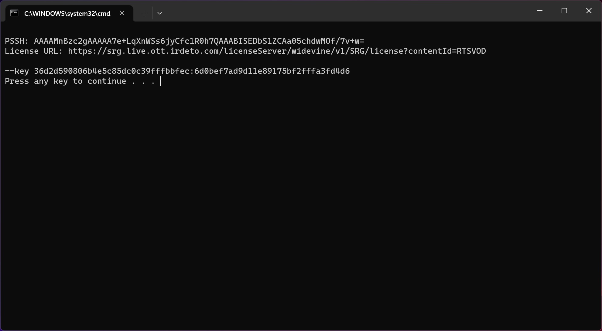 N_m3u8DL-RE -M format=mp4 --key 36d2d590806b4e5c85dc0c39fffbbfec:6d0bef7ad9d11e89175bf2fffa3fd4d6 "https://rtsvod-euwe.akamaized.net/b3707c92-5800-44a7-9713-febf0ba992dd/RTSVOD-6f63bf51-6333.ism/manifest(format=mpd-time-csf,encryption=cenc)" --save-name "video"