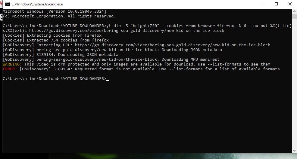 yt-dlp -S "height:720" --cookies-from-browser firefox -N 6 --output %%(title)s.%%(ext)s only works with cookie browser