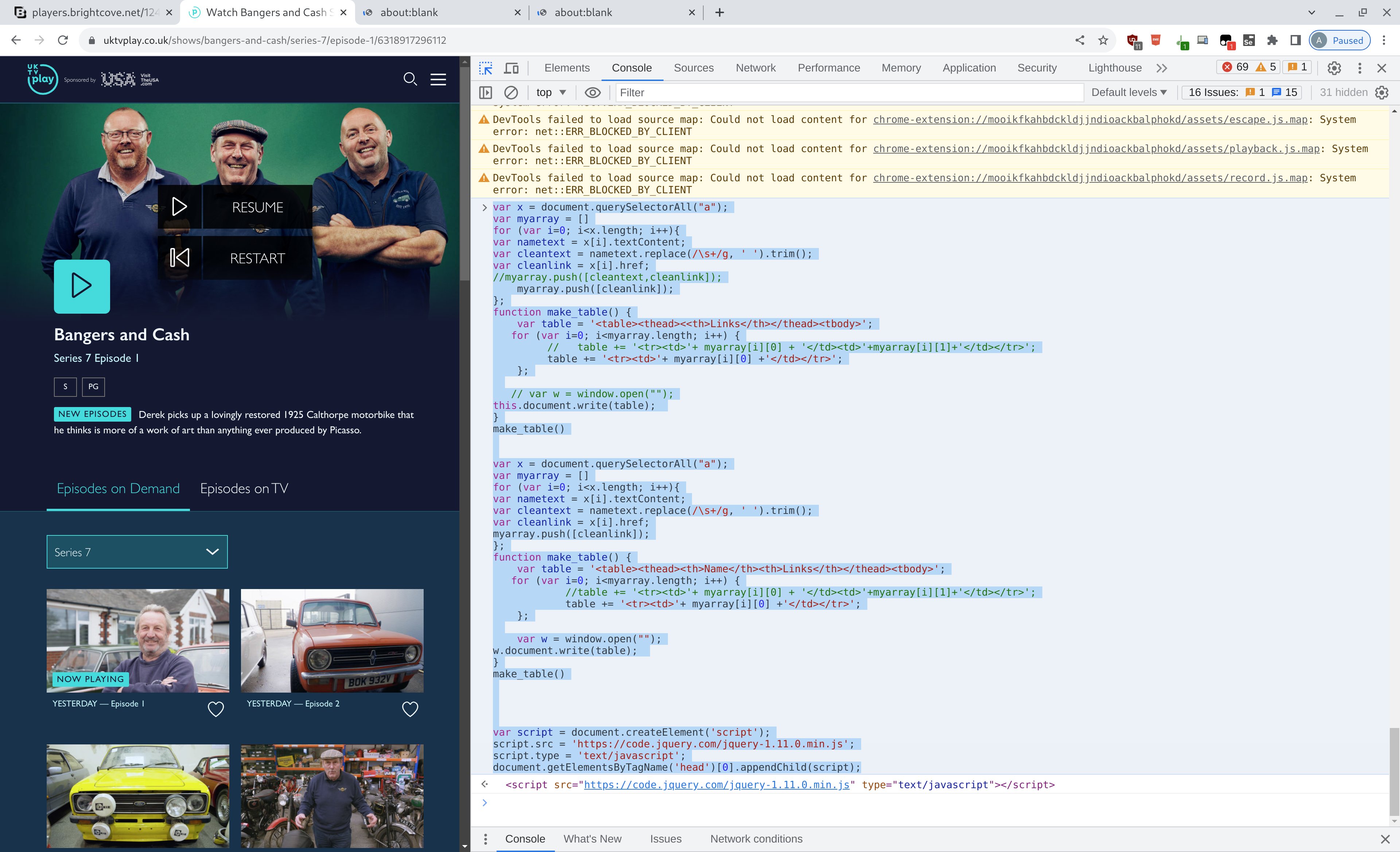 Will produce a list of urls rendered on another browser page. In Firefox: you may need to type 'allow pasting' into the console window and to allow pop-ups. See on-screen instructions.