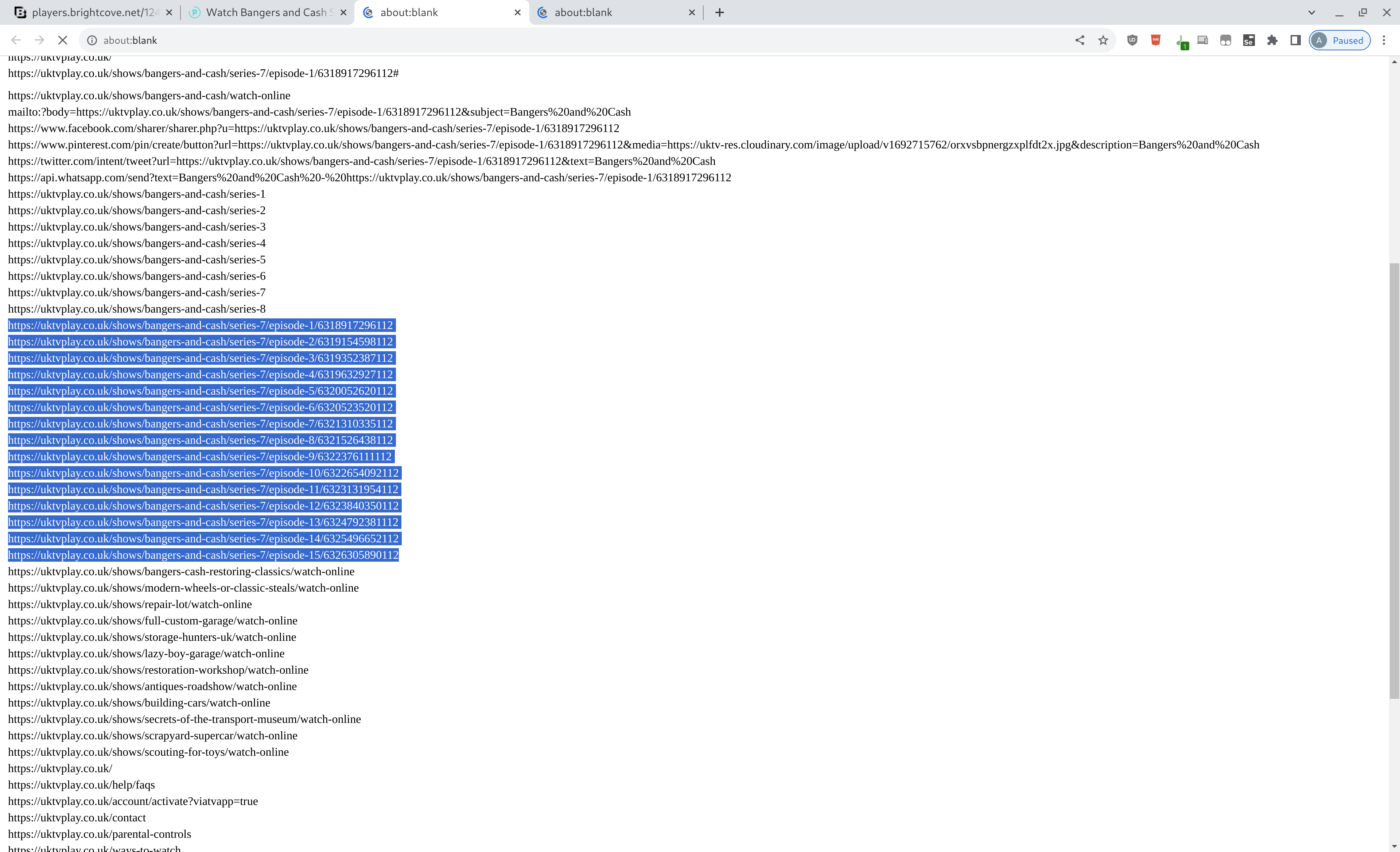 seq 1 10 | xargs -I{} curl -ks https://uktvplay.co.uk/shows/bangers-and-cash/series-{} | sed -e "s#<a href=./shows#\nhref=./shows#g" | awk "BEGIN{FS=\"\042\"} !/autoplay/ && /series-..episode.*title=/ { gsub(/href=./,\"https://uktvplay.co.uk\",$1); print $1 }"