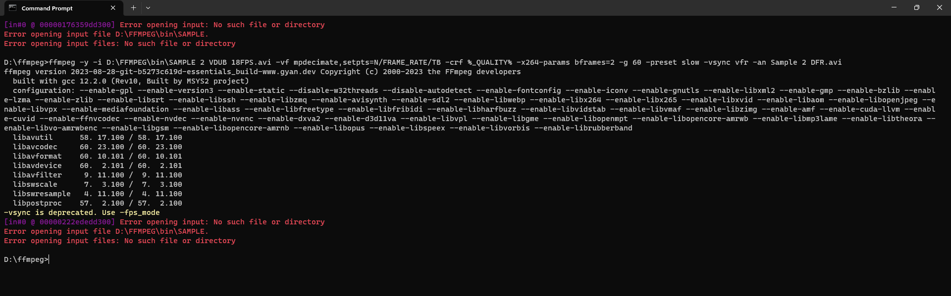 14. Since your path/file name has spaces it it you need to put it in quotes: "C:\FFMPEG\bin\SAMPLE 2 VDUB 18FPS.AVI".