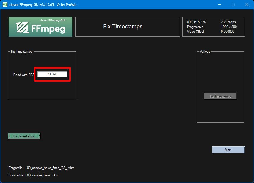 Load your movie, click main, click various, click fix timestamps, insert 23.976, click fix timestamps.