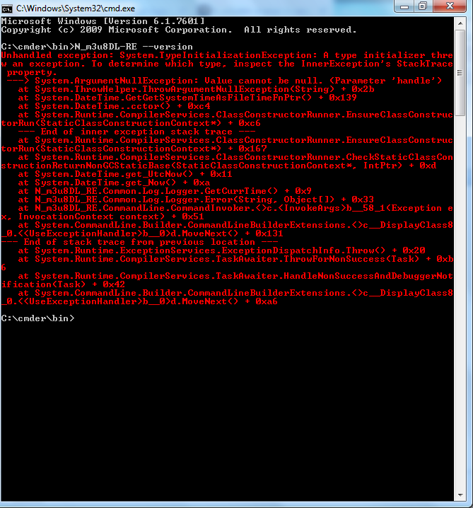 also i have cmder to replace default cdm window. but your problem isn't win7 or cmder or simply cmd window, i think you don't run right command from you have the RE .exe