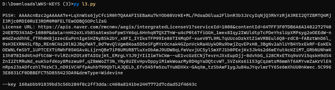 unable to get key with wks-keys (able to get keys for other sites videos)Code:https://apis.naver.com/rmcnmv/aegis/intergratedLicenseV1?serviceId=1008&contentId=647FF3F07DB6A6A148227274024EB7D343AD-1080P&data=eYm9uLLGK5QE_bi8NzH6ISYK6qL6HnhqN7QXZ7nW-u4cP0t6TfiGGH_1wex8Iqy2IWUldtpTcPDeYhslUpXMPsyg2oOEEdW-nm4dZeddhhE_fTRh0K8jzzecEuPrnIgeSHZNyBSk2bY_x8FI_IYIksTFP99Ie86TI4MqDf-xueV07L9RLTqUUcoDzkXtZiwVRBEul6Q8-rdC8-fABztWnD6l_9sH3EXRN4SLfBp_REnNC4s20lN2JBqfWA7_0d7wvQlVgm8Koa5D5eSFgMYrOcnak4GZpnVckRa4UykDRu9bwjZqvEPxH0_3BgNv2ahlUYB4YbxEkRF-EoKEkOEWNLfmSb7_1UPTCEX7iRWhF05KGAvALijrnQBe7iP8UMURB7luXxObAmJ9UDW8qLfwVuvjUC5ylSmXFJ1b0PEejKx3Jk4s2d6wEYut4cKZiM7_GRbNUNhwK13h878I6d4tndftC6W-YvlRZcHZOtz0TAIOzjKt_EMrgLY3J9jYIiIimTkCKm--uE1vcGzECNjTevrnJXxEupDjj-8dvhbG_i28CRxE7Xq9oVVi5qskH9dS4ZnI2ZtMRuNd_euKSofdKoy8Mszwu0f_qZ8mWoZT3N_YNy8UZEvHpvDppyiMiwkWoarMy8D4gYaDQtcvWT_SVedH8LW8O5jc9iDg3SGJlyfJWlKL-2X2nm5r0ujkGX5fADfczhl7HzkC3_nD9iVC4KMwUf_s3sMw-LBZ0fUZkV50WFQy9eA0qTmaFwsMa9InKUst8Xbxcgf42PQdj6nEkKvlwrTY6Se6mXhUU0nKwec.0894D4B645D6C8C948C8277496A2344F&drmType=Widevine
