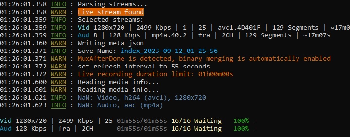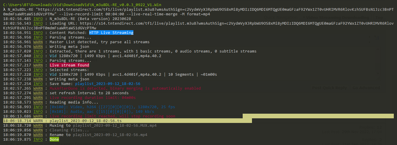 If the command doesn't work, take a fresh link m3u8 in Console Developper tool of your browser (F12)Code:N_m3u8DL-RE "https://s14.tntendirect.com/tf1/live/playlist.m3u8?wmsAuthSign=c2VydmVyX3RpbWU9OS8xMi8yMDIzIDQ6MDI6MTQgUE0maGFzaF92YWx1ZT0vUHRIMVR6RlovKzhSUFBsN1Jzc3BnPT0mdmFsaWRtaW51dGVzPTMw" --live-record-limit 00:04:00 --live-real-time-merge -M format=mp4