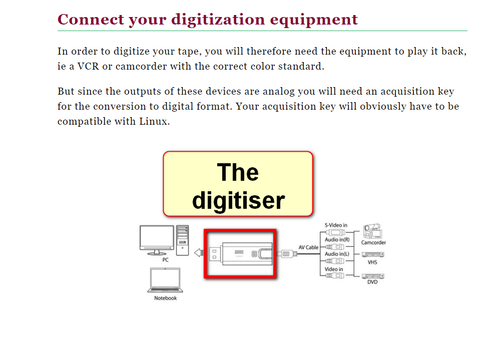 From the article you linked to above, the "acquisition key" (or digitiser):In past I just did it direct on Linux computer, without a separate device between VCR and computer.