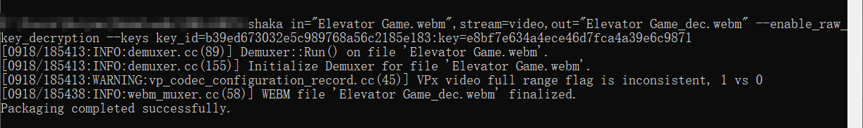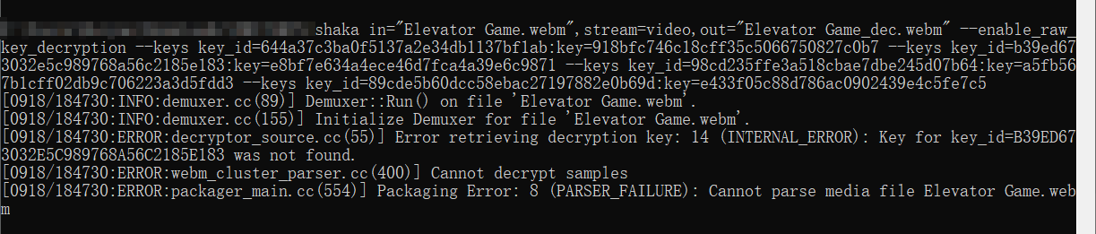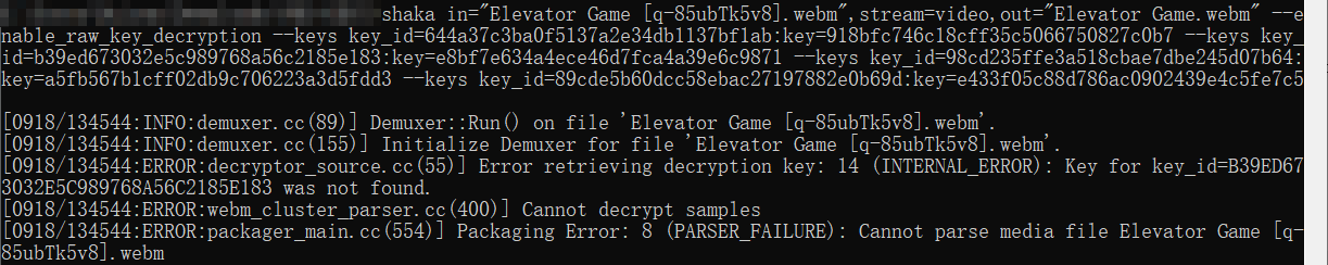 Explanation:Code:shaka in="Elevator Game [q-85ubTk5v8].webm",stream=video,out="Elevator Game.webm" --enable_raw_key_decryption --keys key_id=644a37c3ba0f5137a2e34db1137bf1ab:key=918bfc746c18cff35c5066750827c0b7 --keys key_id=b39ed673032e5c989768a56c2185e183:key=e8bf7e634a4ece46d7fca4a39e6c9871 --keys key_id=98cd235ffe3a518cbae7dbe245d07b64:key=a5fb567b1cff02db9c706223a3d5fdd3 --keys key_id=89cde5b60dcc58ebac27197882e0b69d:key=e433f05c88d786ac0902439e4c5fe7c5to tell the program the information about the file I was inputting.