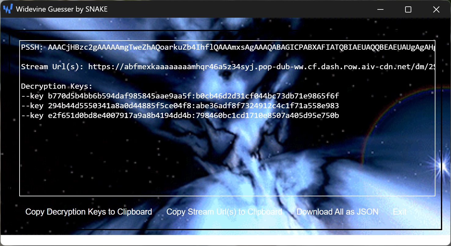 I started it from the command line mp4decrypt.exePHP Code:c06559d8cf945308a7274c7b2b989b18:b59d61fcd97e2c95da34b624472c96f4