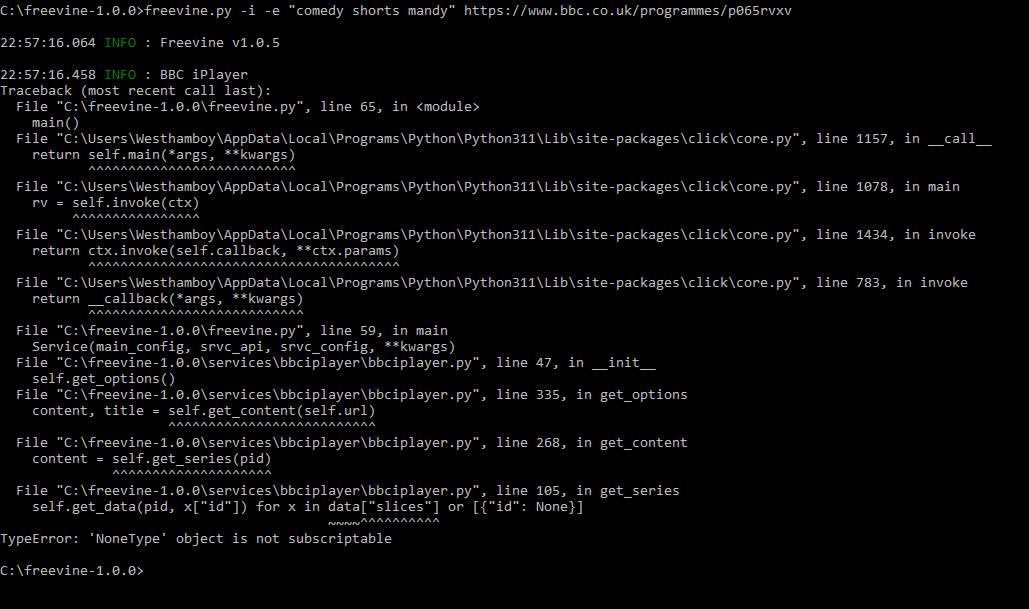 "freevine.py -i -e "mandy" https://www.bbc.co.uk/iplayer/episode/p08gpftk" (this only downloaded the subs) -