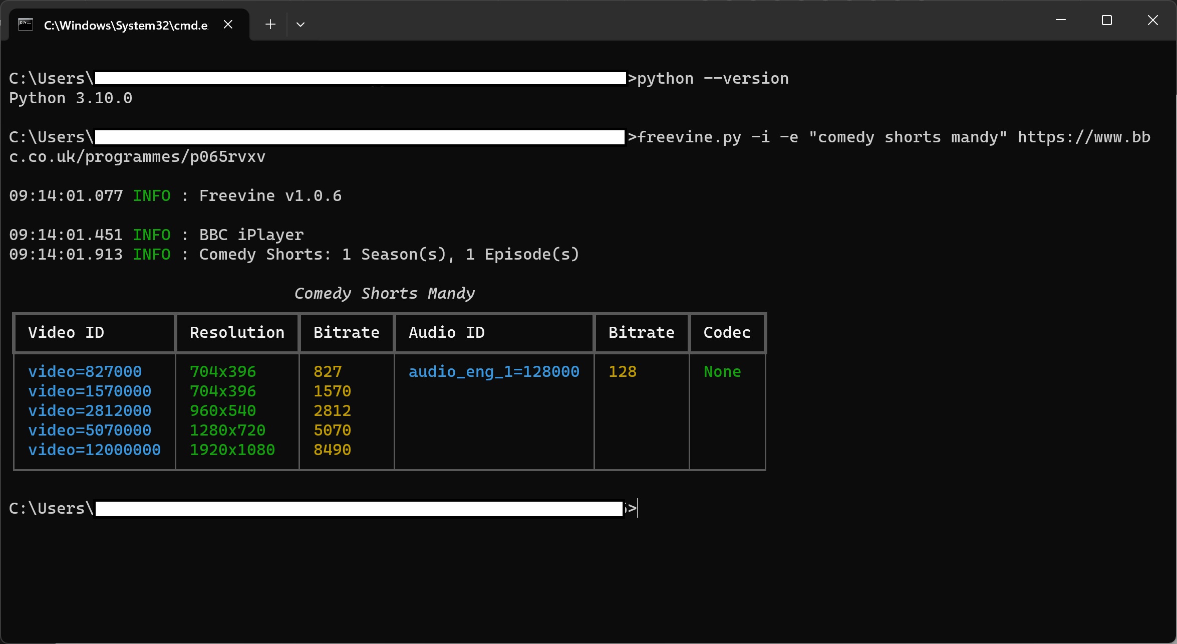 "C:\freevine-1.0.0>freevine.py --episode https://www.bbc.co.uk/iplayer/episode/p08gpftk" (but this failed)