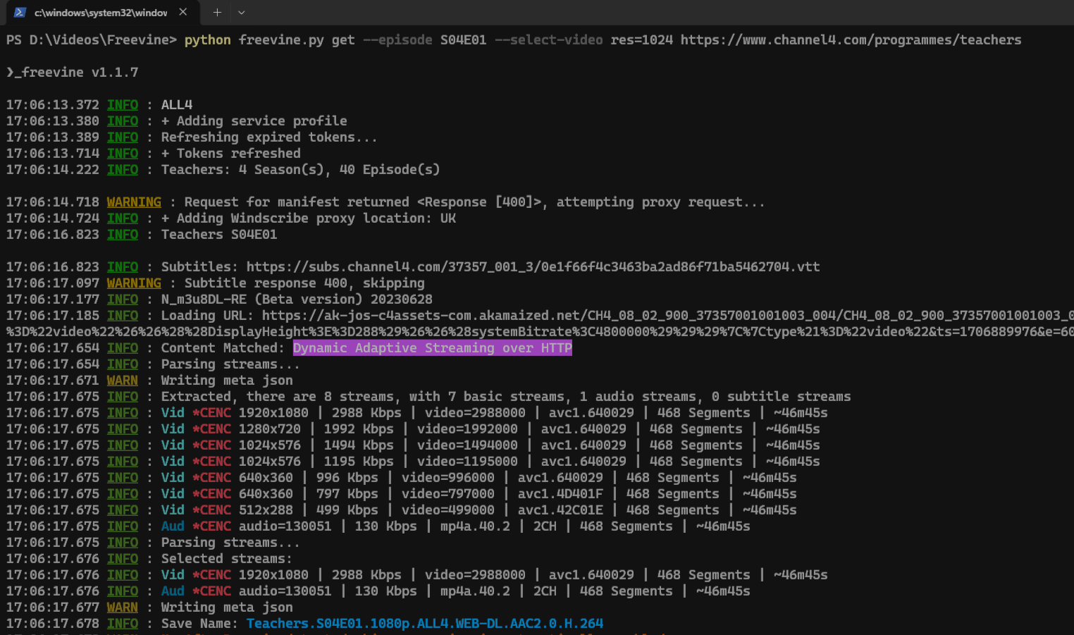 Code:C:\Users\XYZ\Downloads\freevine-main\freevine-main>freevine.py get --episode S04E01 --select-video res=1024 https://www.channel4.com/programmes/teachers ❯_freevine v1.1.1 15:07:08.528 [!!] : New version available! v1.1.7 15:07:08.538 ←[4m←[32mINFO←[0m : ←[1mALL4←[0m 15:07:08.538 ←[4m←[32mINFO←[0m : + Loading user profile 15:07:08.554 ←[4m←[32mINFO←[0m : Using cached tokens 15:07:09.578 ←[4m←[32mINFO←[0m : Teachers: 4 Season(s), 40 Episode(s) Traceback (most recent call last): File "C:\Users\XYZ\Downloads\freevine-main\freevine-main\freevine.py", line 15, in <module> cli() File "C:\Users\XYZ\AppData\Local\Programs\Python\Python312\Lib\site-packages\click\core.py", line 1157, in __call__ return self.main(*args, **kwargs) ^^^^^^^^^^^^^^^^^^^^^^^^^^ File "C:\Users\XYZ\AppData\Local\Programs\Python\Python312\Lib\site-packages\click\core.py", line 1078, in main rv = self.invoke(ctx) ^^^^^^^^^^^^^^^^ File "C:\Users\XYZ\AppData\Local\Programs\Python\Python312\Lib\site-packages\click\core.py", line 1688, in invoke return _process_result(sub_ctx.command.invoke(sub_ctx)) ^^^^^^^^^^^^^^^^^^^^^^^^^^^^^^^ File "C:\Users\XYZ\AppData\Local\Programs\Python\Python312\Lib\site-packages\click\core.py", line 1434, in invoke return ctx.invoke(self.callback, **ctx.params) ^^^^^^^^^^^^^^^^^^^^^^^^^^^^^^^^^^^^^^^ File "C:\Users\XYZ\AppData\Local\Programs\Python\Python312\Lib\site-packages\click\core.py", line 783, in invoke return __callback(*args, **kwargs) ^^^^^^^^^^^^^^^^^^^^^^^^^^^ File "C:\Users\XYZ\Downloads\freevine-main\freevine-main\utils\commands.py", line 81, in get Service(config, **kwargs) File "C:\Users\XYZ\Downloads\freevine-main\freevine-main\services\channel4\channel4.py", line 63, in __init__ self.get_options() File "C:\Users\XYZ\Downloads\freevine-main\freevine-main\services\channel4\channel4.py", line 378, in get_options self.download(download, title, bearer) File "C:\Users\XYZ\Downloads\freevine-main\freevine-main\services\channel4\channel4.py", line 381, in download self.res, manifest, token = self.get_mediainfo(stream.id, self.quality, bearer) ^^^^^^^^^^^^^^^^^^^^^^^^^^^^^^^^^^^^^^^^^^^^^^^^^^^ File "C:\Users\XYZ\Downloads\freevine-main\freevine-main\services\channel4\channel4.py", line 306, in get_mediainfo heights, self.soup = get_heights(self.client, manifest) ^^^^^^^^^^^^^^^^^^^^^^^^^^^^^^^^^^ File "C:\Users\XYZ\Downloads\freevine-main\freevine-main\utils\utilities.py", line 125, in get_heights r.raise_for_status() File "C:\Users\XYZ\AppData\Local\Programs\Python\Python312\Lib\site-packages\requests\models.py", line 1021, in raise_for_status raise HTTPError(http_error_msg, response=self) requests.exceptions.HTTPError: 400 Client Error: Bad Request for url: http://ak.dash01.stream.c4assets.com/wvmod-stream/CH4_33_05_42_37357001001003_003.mpd?c3.ri=13634185812973612547 C:\Users\XYZ\Downloads\freevine-main\freevine-main>freevine.py get --episode S04E01 --select-video res=1024 https://www.channel4.com/programmes/teachers ❯_freevine v1.1.1 15:07:22.176 [!!] : New version available! v1.1.7 15:07:22.184 ←[4m←[32mINFO←[0m : ←[1mALL4←[0m 15:07:22.184 ←[4m←[32mINFO←[0m : + Loading user profile 15:07:22.196 ←[4m←[32mINFO←[0m : Using cached tokens 15:07:22.891 ←[4m←[32mINFO←[0m : Teachers: 4 Season(s), 40 Episode(s) 15:07:24.572 ←[4m←[32mINFO←[0m : Teachers S04E01 15:07:24.575 ←[4m←[32mINFO←[0m : 00000000000000000000000003360392:227a61dd16ec911b9452a51ac97a1906 15:07:24.671 INFO : N_m3u8DL-RE (Beta version) 20230628 15:07:24.685 INFO : Loading URL: tmp\manifest.mpd 15:07:24.692 INFO : Content Matched: Dynamic Adaptive Streaming over HTTP 15:07:24.693 INFO : Parsing streams... 15:07:24.714 WARN : Writing meta json 15:07:24.723 INFO : Extracted, there are 9 streams, with 7 basic streams, 1 audio streams, 1 subtitle streams 15:07:24.723 INFO : Vid *CENC 1920x1080 | 2988 Kbps | video=2988000 | avc1.640029 | 468 Segments | ~46m45s 15:07:24.724 INFO : Vid *CENC 1280x720 | 1992 Kbps | video=1992000 | avc1.640029 | 468 Segments | ~46m45s 15:07:24.724 INFO : Vid *CENC 1024x576 | 1494 Kbps | video=1494000 | avc1.640029 | 468 Segments | ~46m45s 15:07:24.724 INFO : Vid *CENC 1024x576 | 1195 Kbps | video=1195000 | avc1.640029 | 468 Segments | ~46m45s 15:07:24.725 INFO : Vid *CENC 640x360 | 996 Kbps | video=996000 | avc1.640029 | 468 Segments | ~46m45s 15:07:24.725 INFO : Vid *CENC 640x360 | 797 Kbps | video=797000 | avc1.4D401F | 468 Segments | ~46m45s 15:07:24.725 INFO : Vid *CENC 512x288 | 499 Kbps | video=499000 | avc1.42C01E | 468 Segments | ~46m45s 15:07:24.725 INFO : Aud *CENC audio=130051 | 130 Kbps | mp4a.40.2 | 2CH | 468 Segments | ~46m45s 15:07:24.725 INFO : Sub English | 1 Segment | ~46m45s 15:07:24.726 INFO : Parsing streams... 15:07:24.728 INFO : Selected streams: 15:07:24.728 INFO : Vid *CENC 1920x1080 | 2988 Kbps | video=2988000 | avc1.640029 | 468 Segments | ~46m45s 15:07:24.729 INFO : Aud *CENC audio=130051 | 130 Kbps | mp4a.40.2 | 2CH | 468 Segments | ~46m45s 15:07:24.729 INFO : Sub English | 1 Segment | ~46m45s 15:07:24.729 WARN : Writing meta json 15:07:24.732 INFO : Save Name: Teachers.S04E01.1080p.ALL4.WEB-DL.AAC2.0.H.264 15:07:24.734 WARN : MuxAfterDone is detected, binary merging is automatically enabled 15:07:24.735 INFO : Start downloading...Aud audio=130051 | 130 Kbps | mp4a.40.2 | 2CH 15:07:24.735 INFO : Start downloading...Vid 1920x1080 | 2988 Kbps | video=2988000 | avc1.640029 15:07:24.880 WARN : Type: cenc 15:07:24.882 WARN : PSSH(WV): CAESEAAAAAAAAAAAAAAAAAM2A5IaCHJibWNoNHR2IiQwMDAwMDAwMC0wMDAwLTAwMDAtMDAwMC0wMDAwMDMzNjAzOTIyAA== 15:07:24.884 WARN : KID: 00000000000000000000000003360392 15:07:24.885 INFO : Trying to search for KEY from text file... 15:07:24.890 INFO : OK 00000000000000000000000003360392:227a61dd16ec911b9452a51ac97a1906 15:07:24.891 WARN : Type: cenc 15:07:24.893 WARN : PSSH(WV): CAESEAAAAAAAAAAAAAAAAAM2A5IaCHJibWNoNHR2IiQwMDAwMDAwMC0wMDAwLTAwMDAtMDAwMC0wMDAwMDMzNjAzOTIyAA== 15:07:24.894