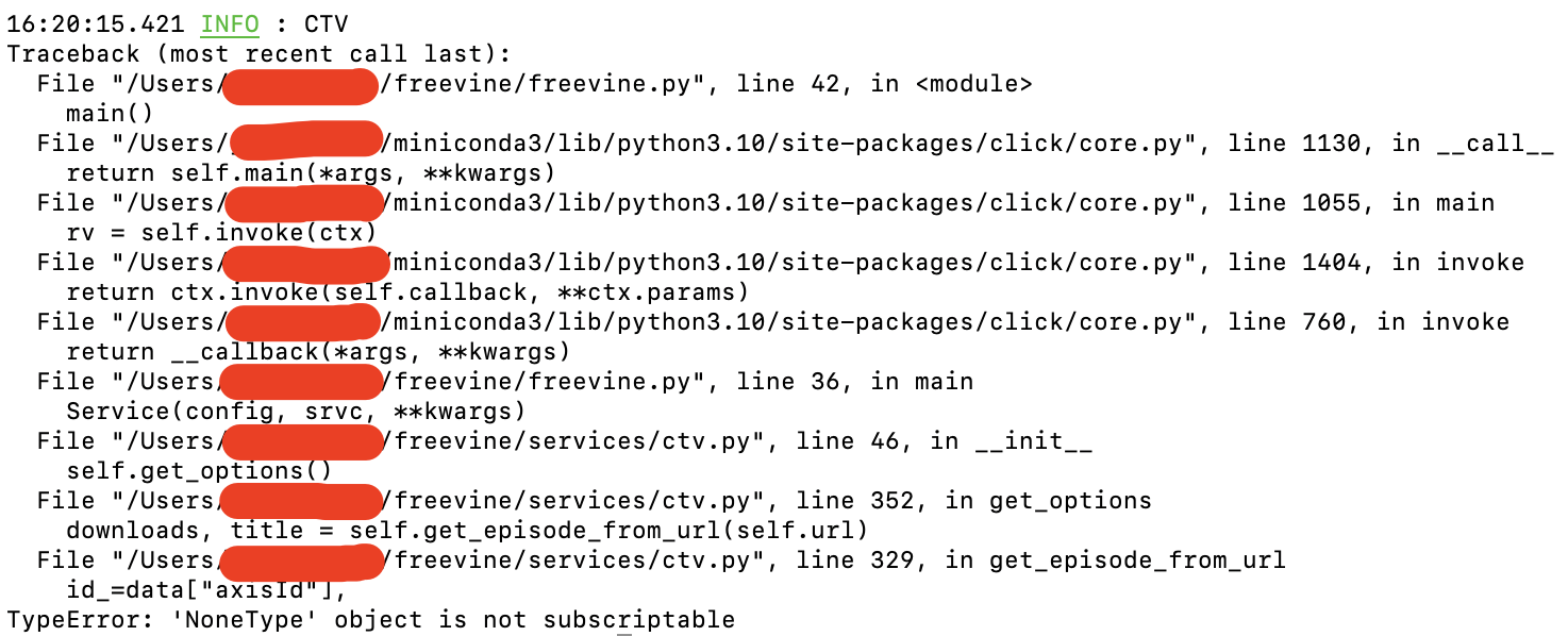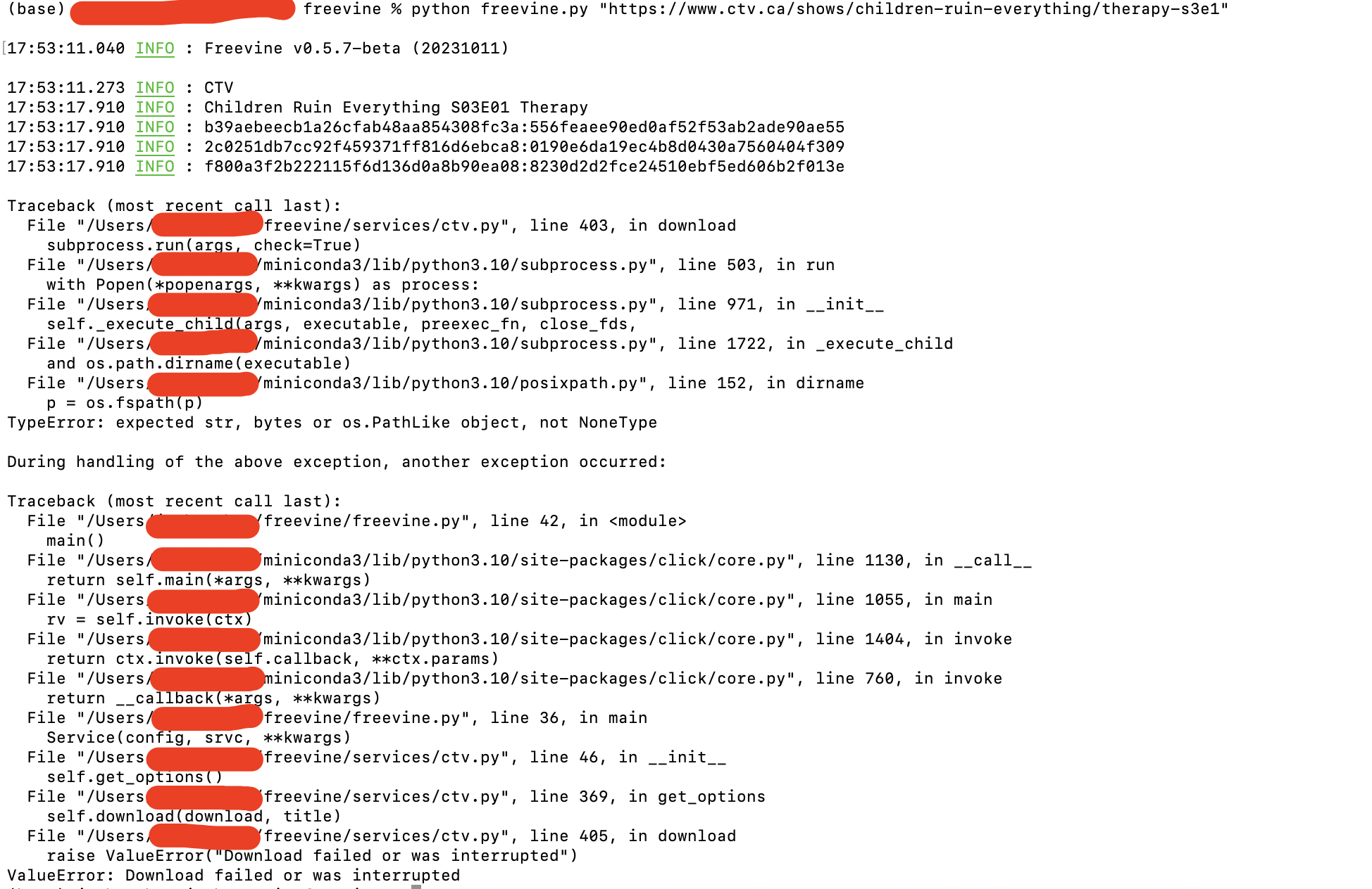Code:Traceback (most recent call last): File "/home/splash/freevine/services/channel4.py", line 307, in download subprocess.run(args, check=True) File "/usr/lib/python3.10/subprocess.py", line 503, in run with Popen(*popenargs, **kwargs) as process: File "/usr/lib/python3.10/subprocess.py", line 971, in __init__ self._execute_child(args, executable, preexec_fn, close_fds, File "/usr/lib/python3.10/subprocess.py", line 1738, in _execute_child and os.path.dirname(executable) File "/usr/lib/python3.10/posixpath.py", line 152, in dirname p = os.fspath(p) TypeError: expected str, bytes or os.PathLike object, not NoneType During handling of the above exception, another exception occurred: -