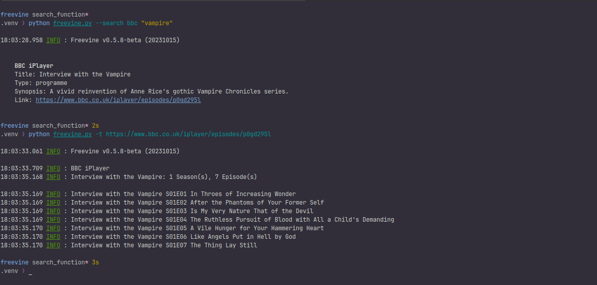 Like always, no two services are alike so results will differ. Some don't have synopsis, and some don't even provide a proper path so I had build it.Code:python freevine.py --search all4 "taskmaster" python freevine.py --search itv,stv "payback"