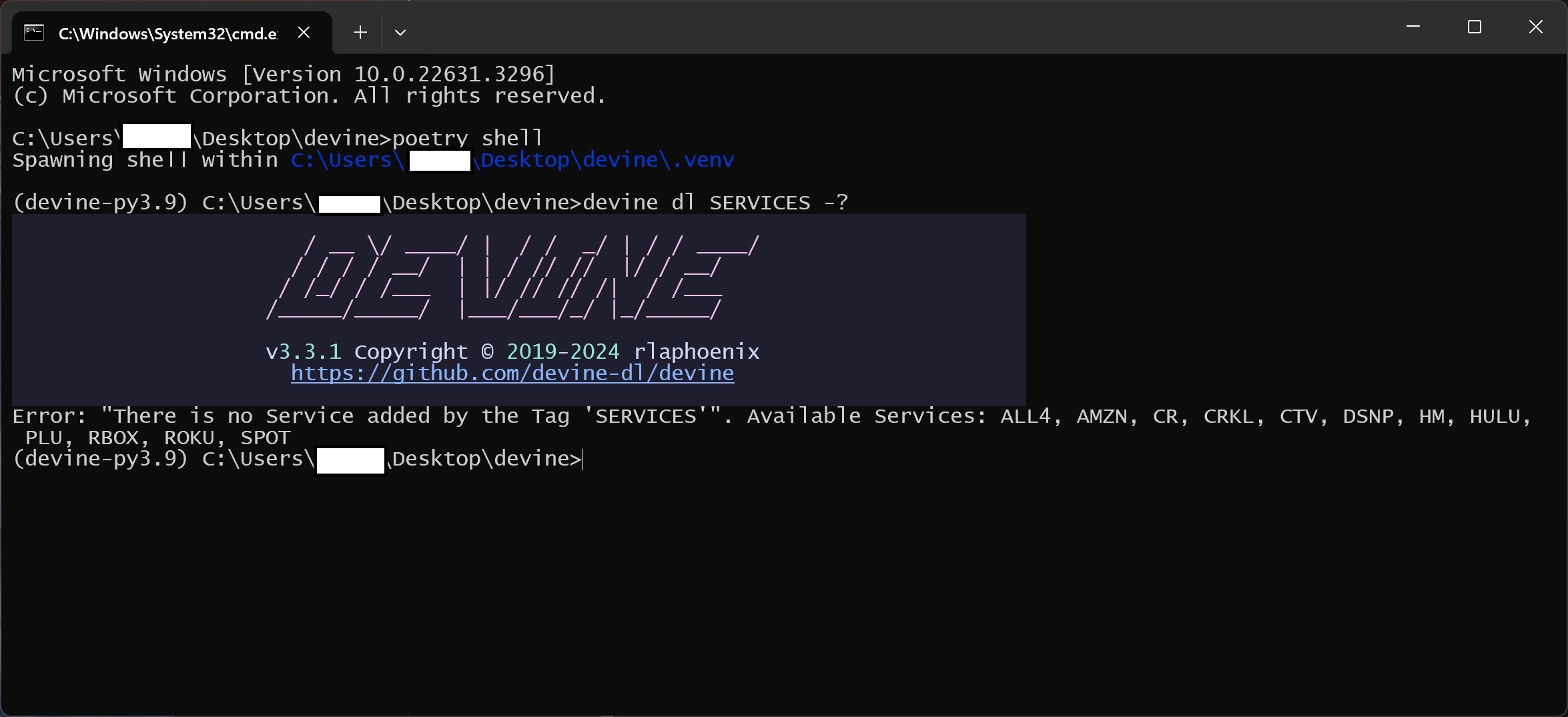 If possible please point out to me what I have done wrong and I have gotten the WVD set up yet because I have not learned how to get that done yet. But clearly I have done something wrong as it says there are no Service added. Thank in advance; you can see at least I am experimenting trying to figure it out.Code:Microsoft Windows [Version 10.0.22000.2538] (c) Microsoft Corporation. All rights reserved. C:\devine>devine dl -w s15e19 CTV shark-tank / __ \/ ____/ | / / _/ | / / ____/ / / / / __/ | | / // // |/ / __/ / /_/ / /___ | |/ // // /| / /___ /_____/_____/ |___/___/_/ |_/_____/ ⠀ v3.3.1 Copyright © 2019-2024 rlaphoenix https://github.com/devine-dl/devine Error: There are no Services added yet, therefore the 'CTV' Service could not be found. C:\devine>Last edited by Tom Saurus; 7th Apr 2024 at 12:43.
